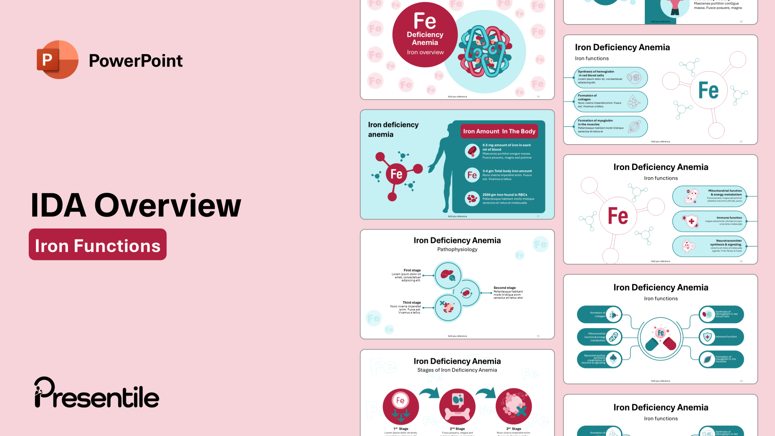 • Get a full suite of beautifully designed slides, detailed sections on "Iron Functions," "Pathophysiology," and even "Stages of Iron Deficiency Anemia." The clean, modern design ensures your content is not just informative but also visually appealing.
