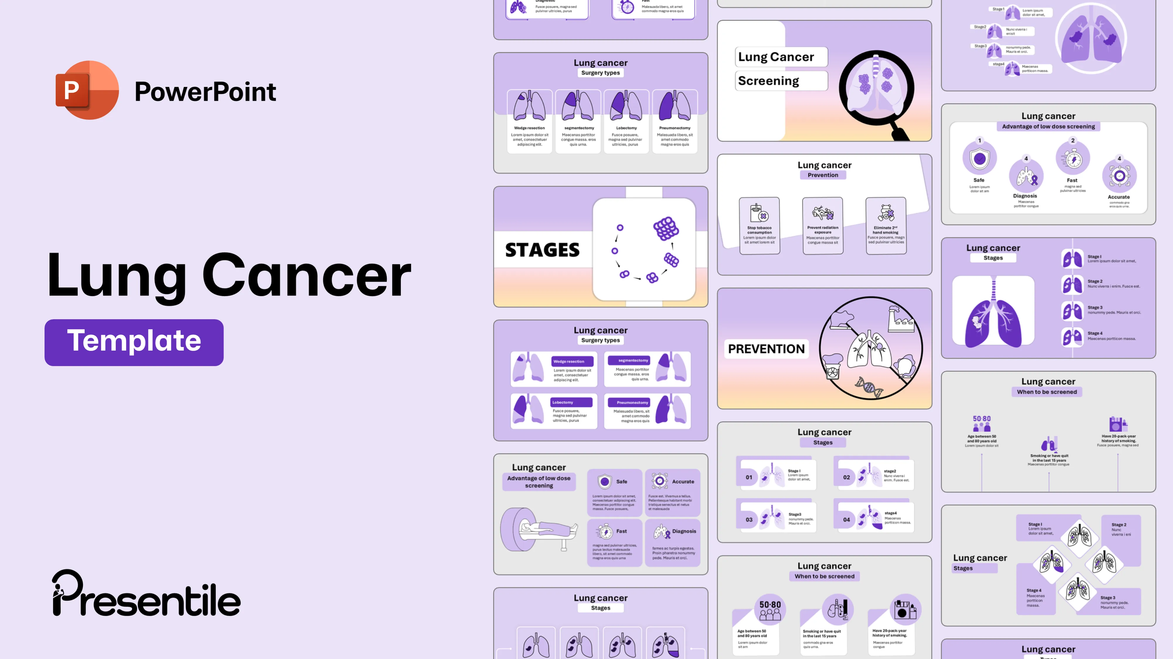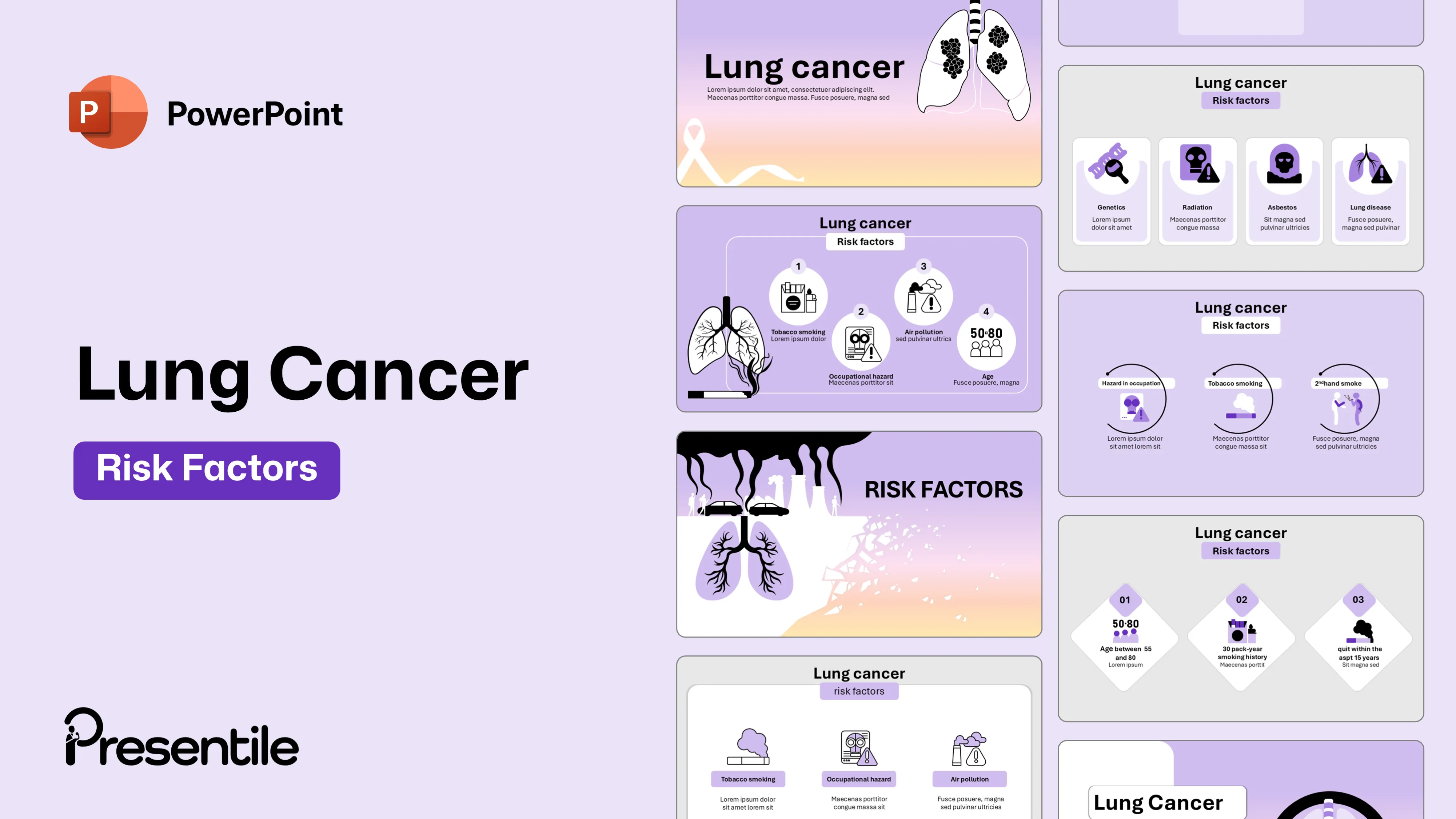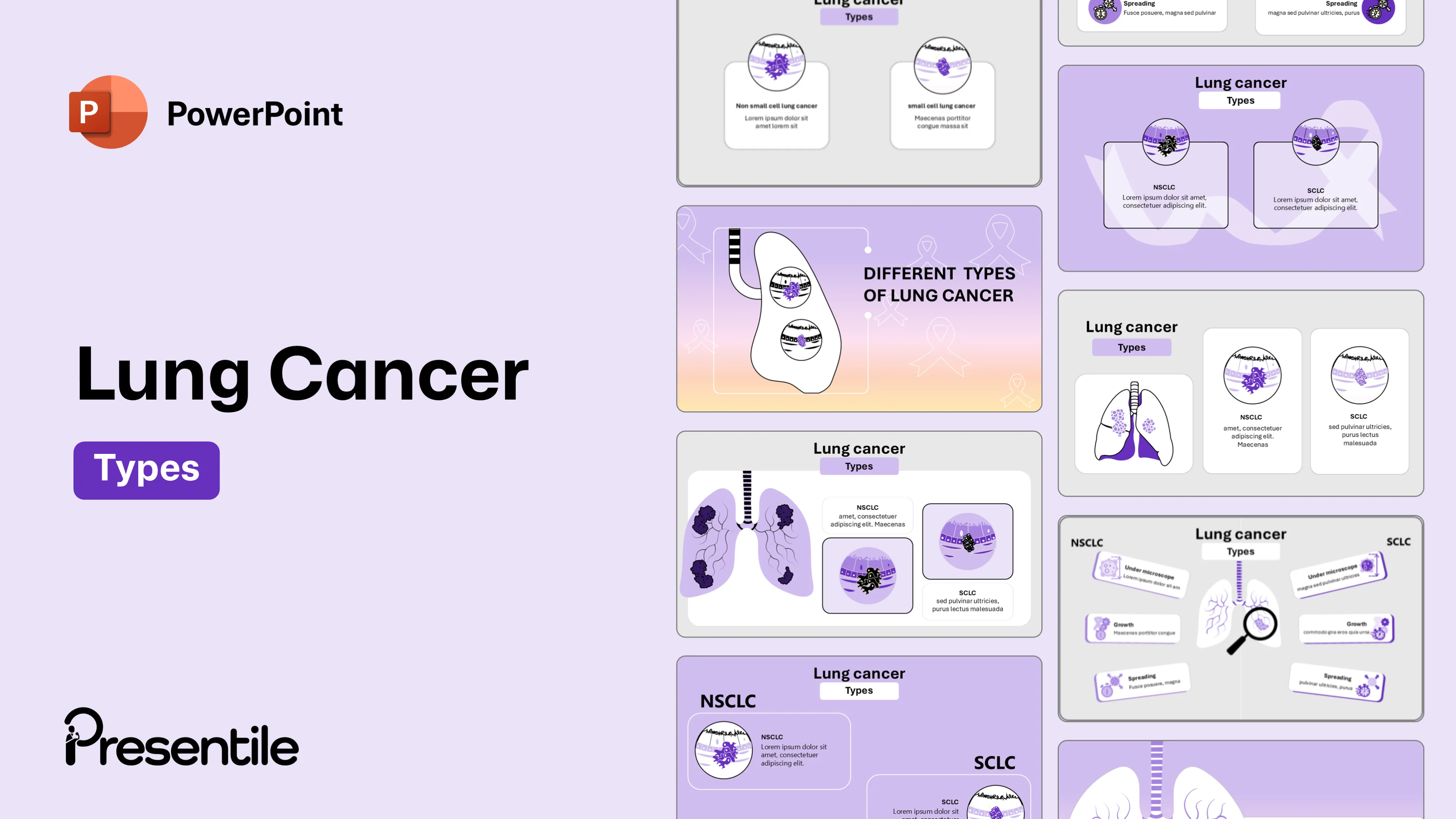 • Definition slides to concisely explain Lung Cancer. The combination of clean text and supporting anatomical illustrations (showing the location of the disease) ensures your audience grasps the core concept instantly.