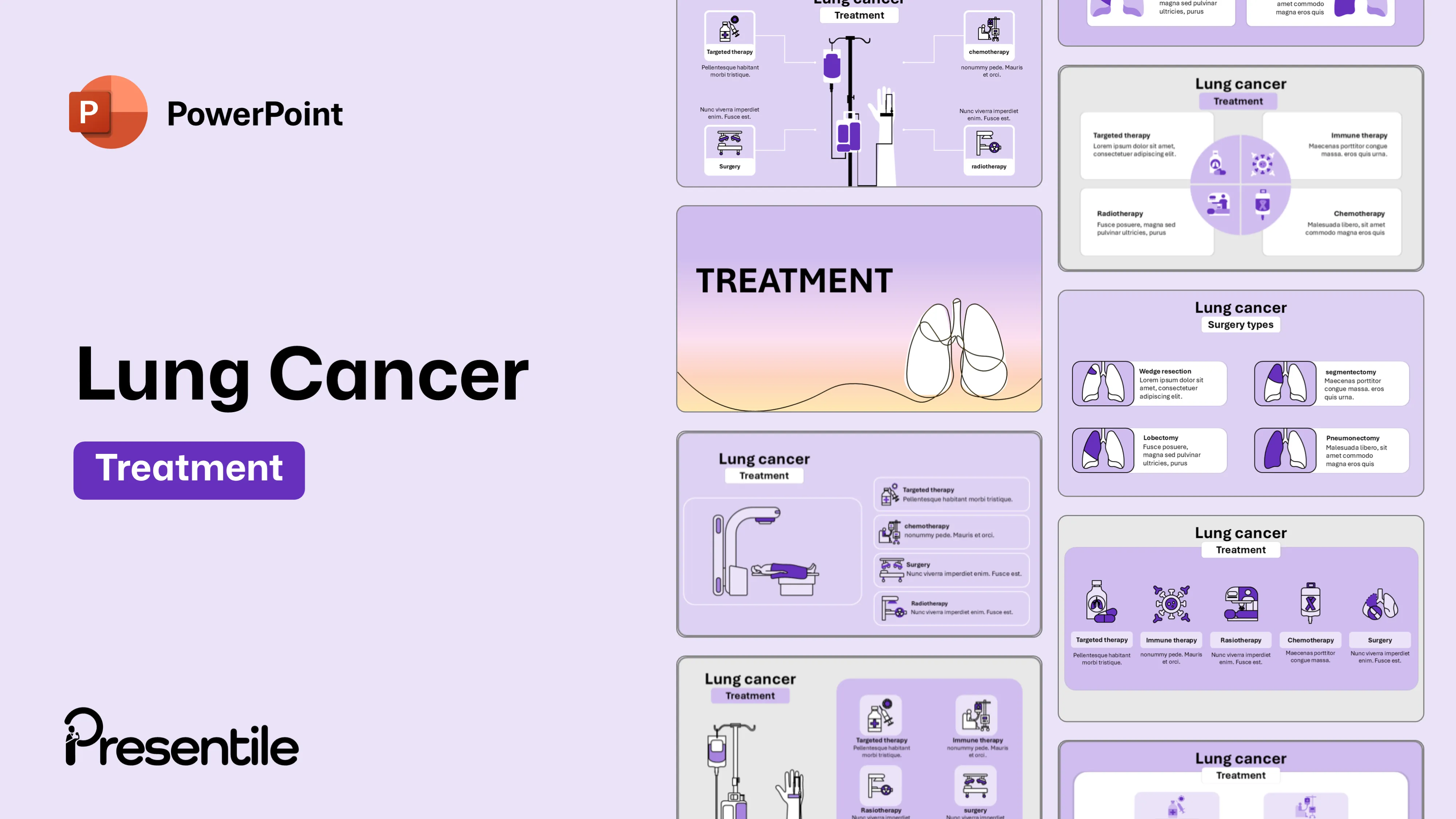 • The major surgical interventions with dedicated visuals for Wedge Resection, Lobectomy, and Pneumonectomy. These slides simplify complex procedures, ensuring your audience understands the anatomical scope of each operation.