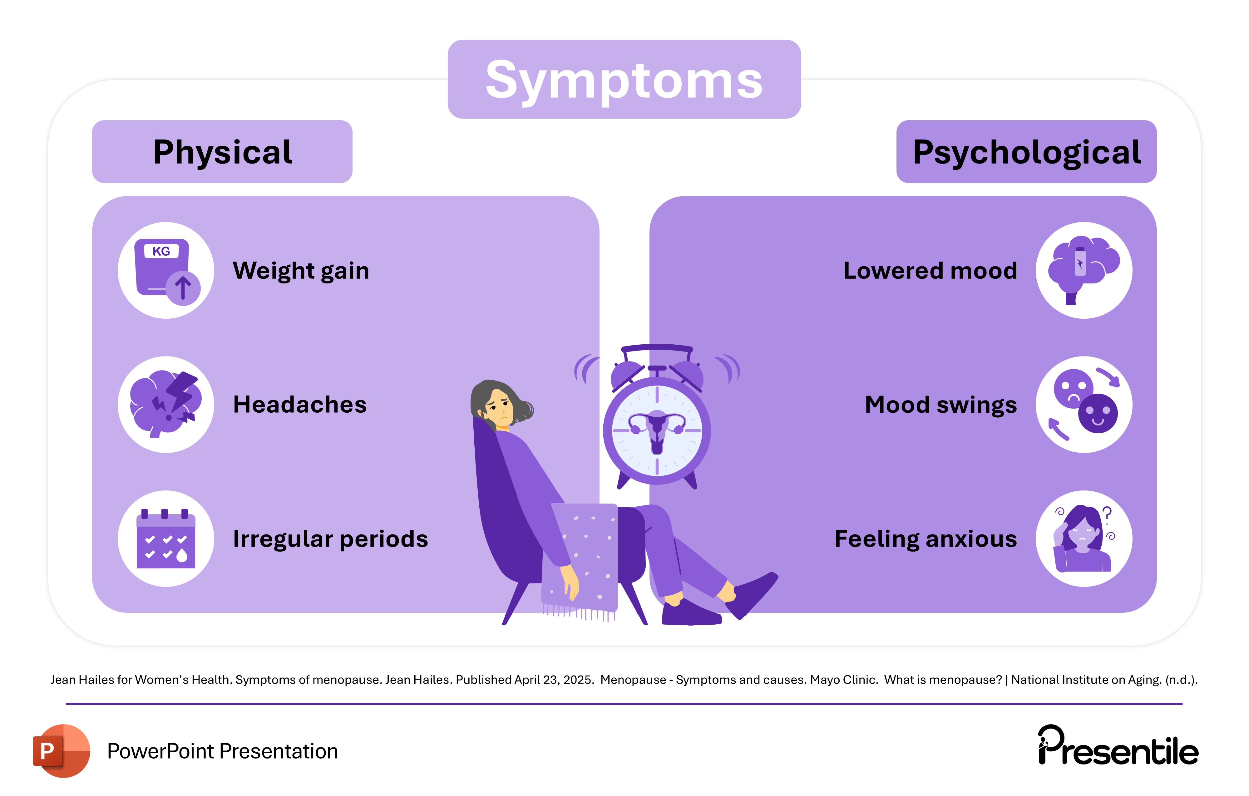 This slide provides a clear, categorized overview of the key symptoms experienced during menopause, dividing them into Physical and Psychological categories. A central illustration of a woman experiencing discomfort reinforces the subject.