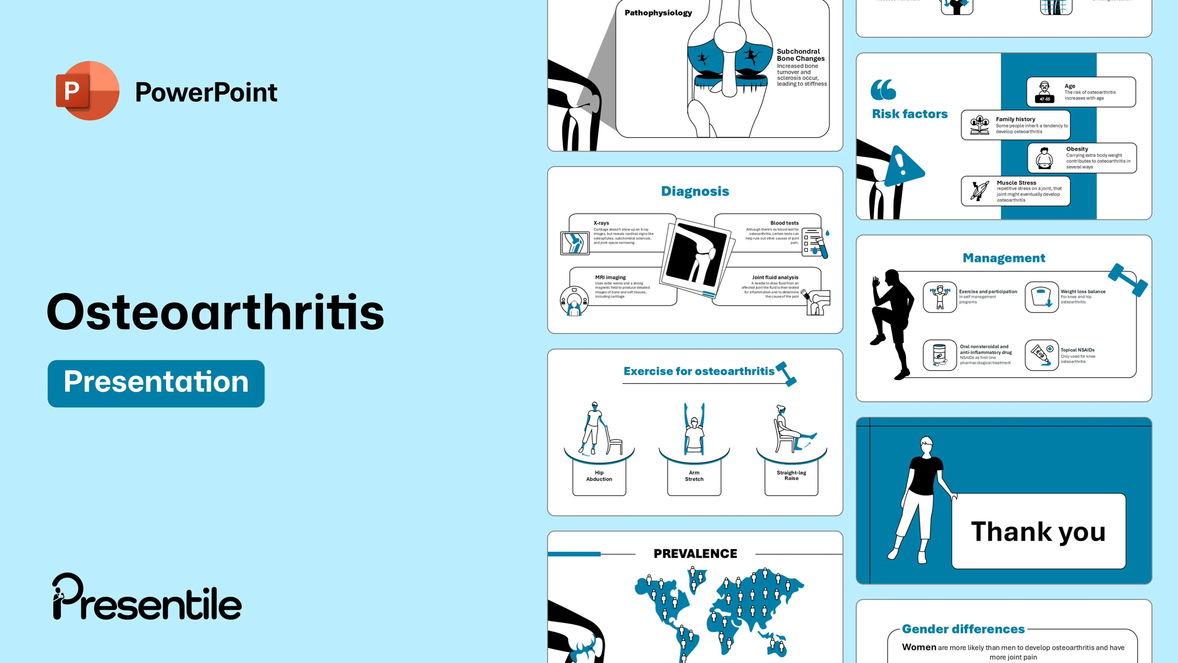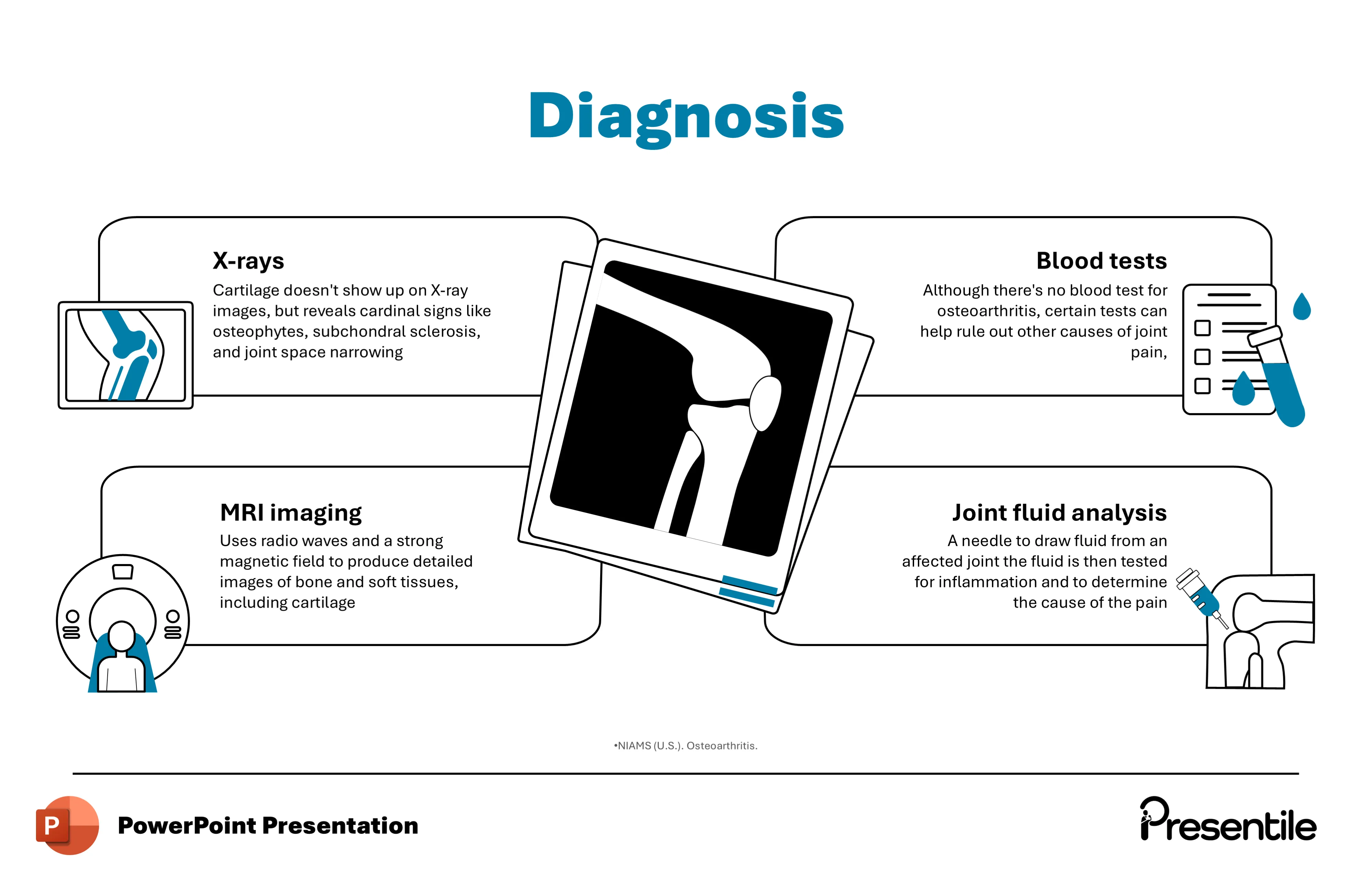 • The professional design simplifies these complex diagnostic processes, making it easy for your audience to understand how osteoarthritis is accurately identified.