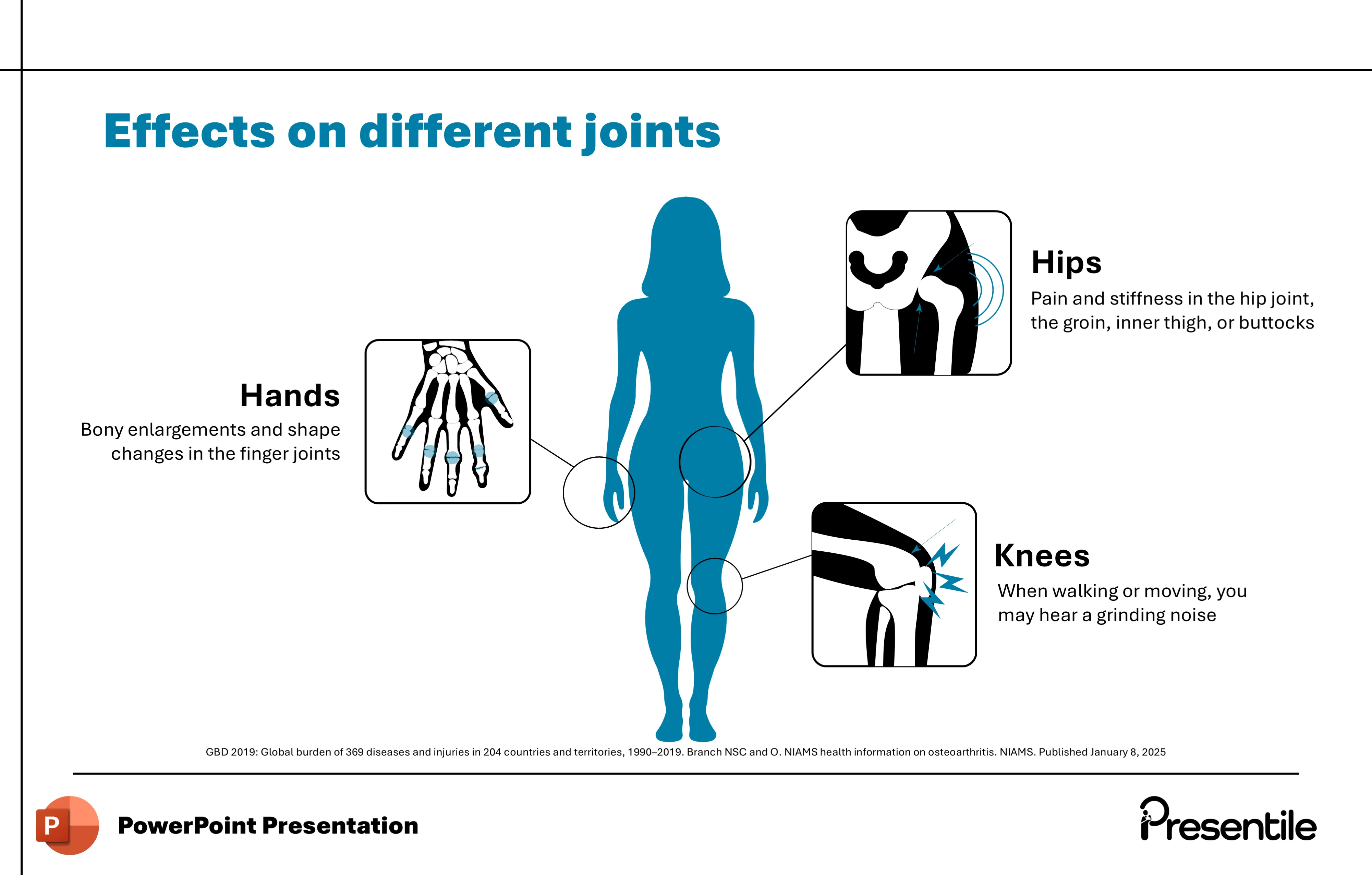 • The icon-based design and central knee joint visual make these symptoms easy to understand and remember, helping your audience quickly recognize the clinical features of osteoarthritis.