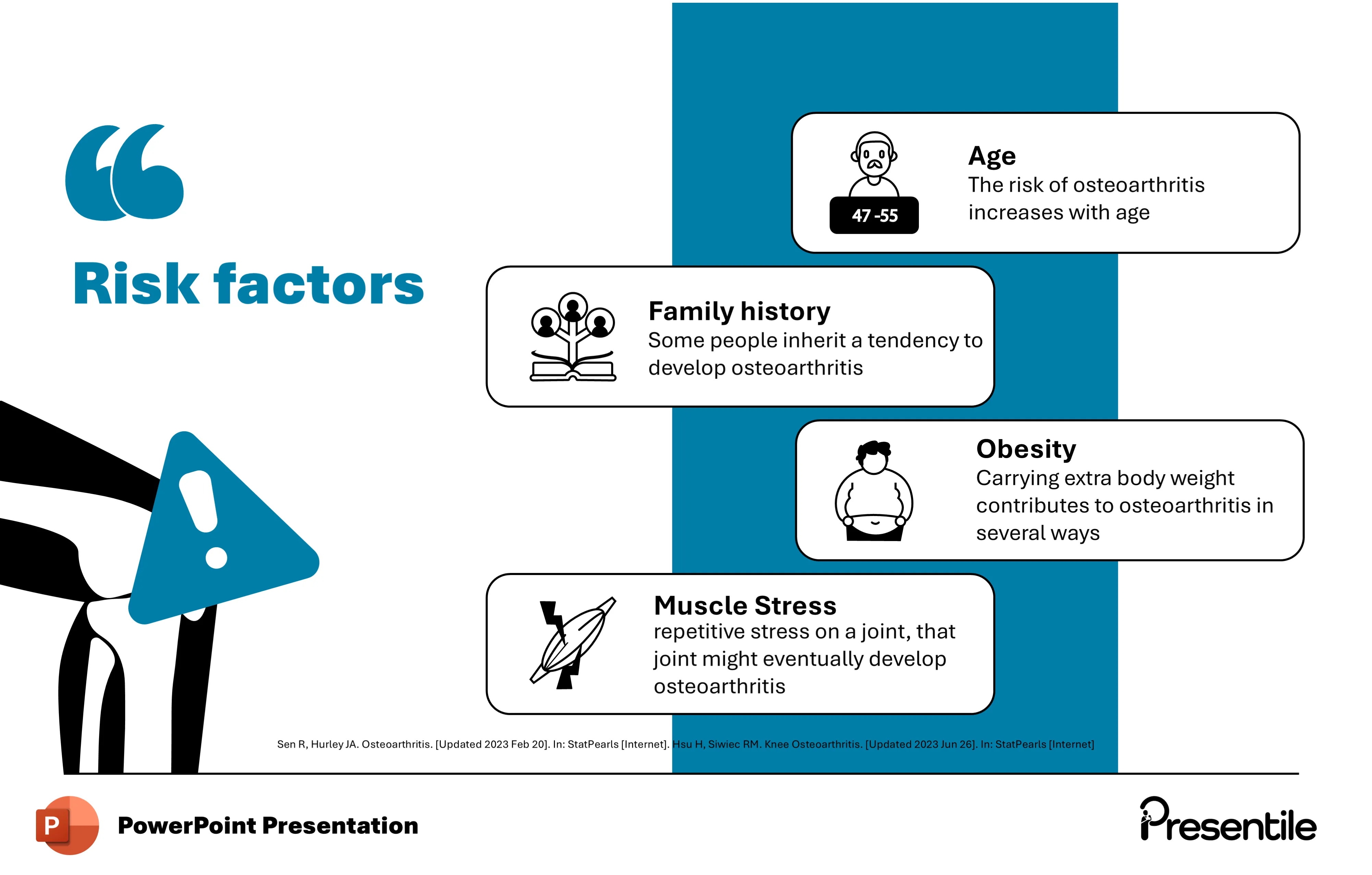 • This slide provides a clear and informative overview of the key risk factors for osteoarthritis.