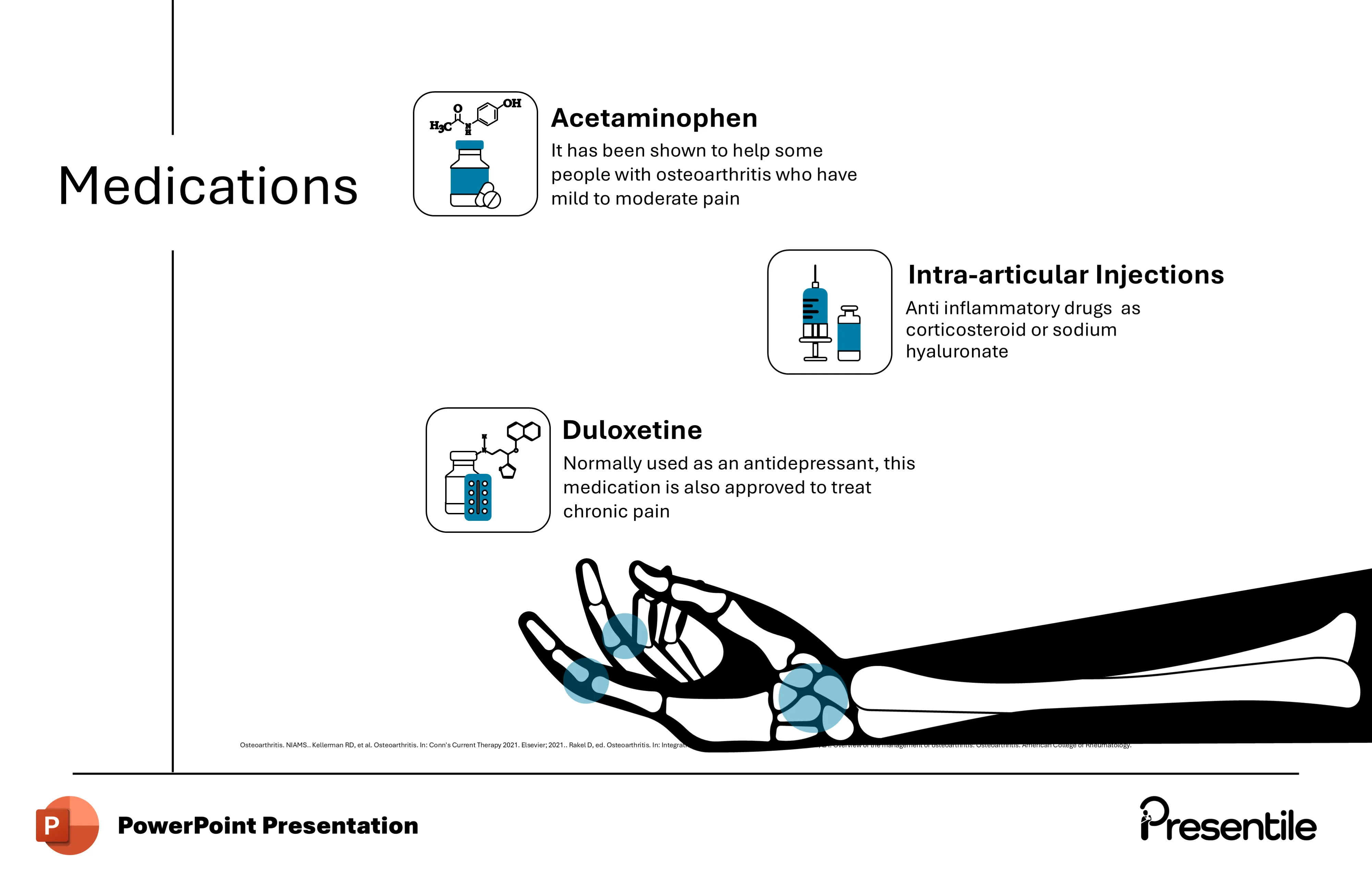 • The clean, organized layout makes these complex treatment strategies easy to understand, helping your audience grasp the full range of medical options for managing osteoarthritis.