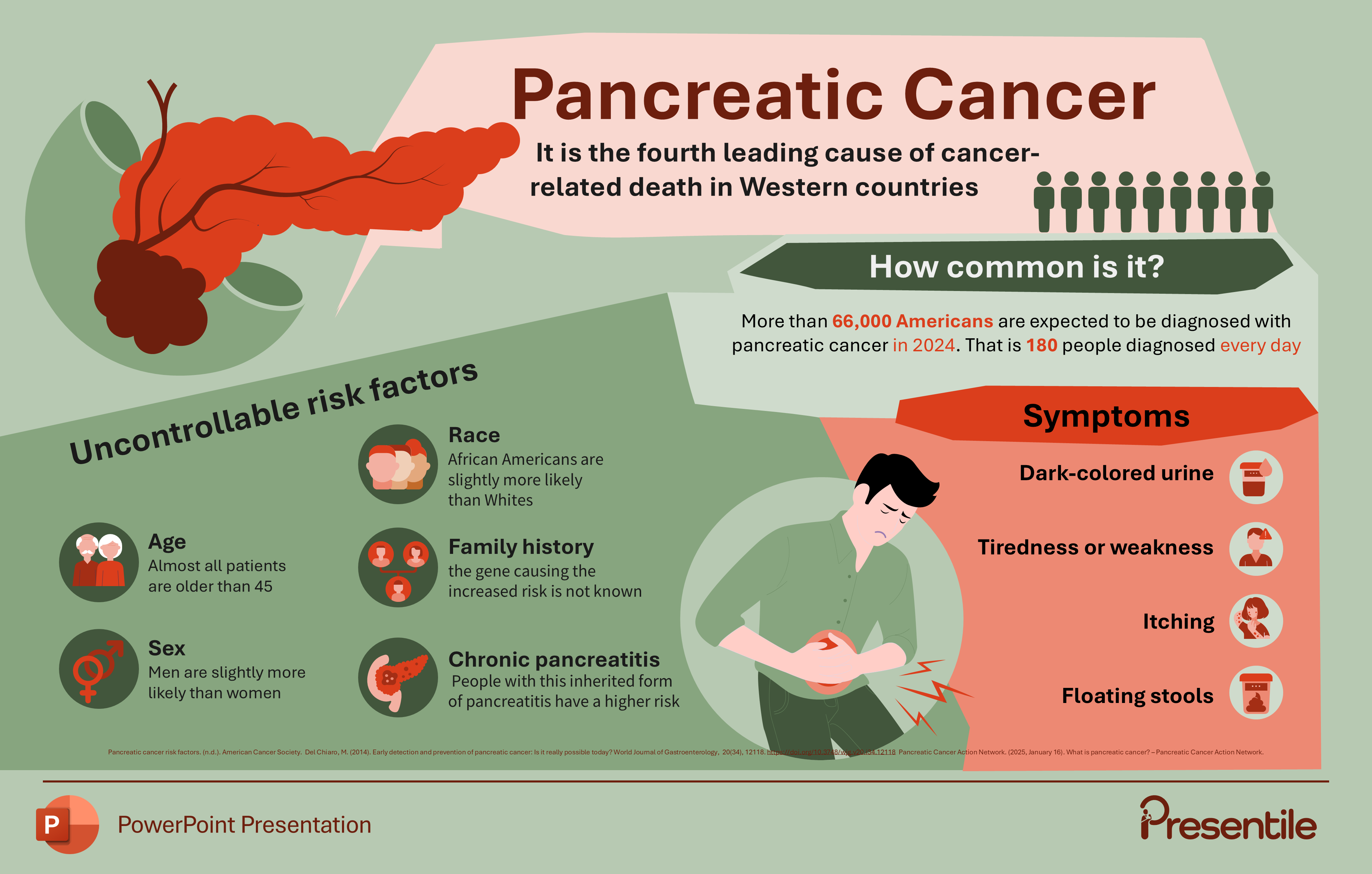 • You can instantly engage your audience with an anatomical illustration of the pancreas and vital statistics, including the estimated 60,440 new pancreatic cancer cases expected in 2024, highlighting the disease's prevalence.