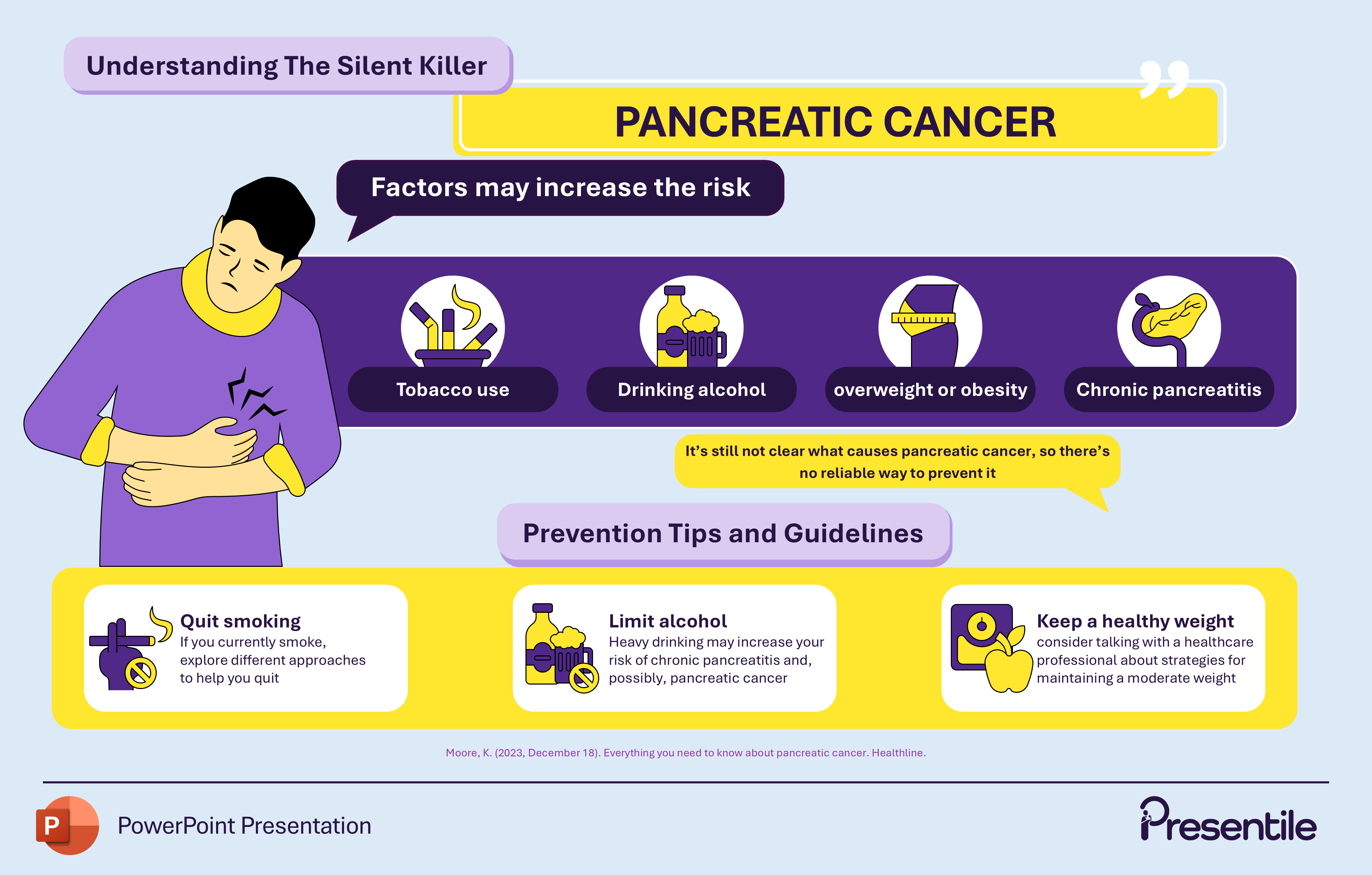 • Define and Emphasize Severity: Clearly define Pancreatic Cancer and highlight its designation as the "Silent Killer," capturing your audience's attention immediately.
