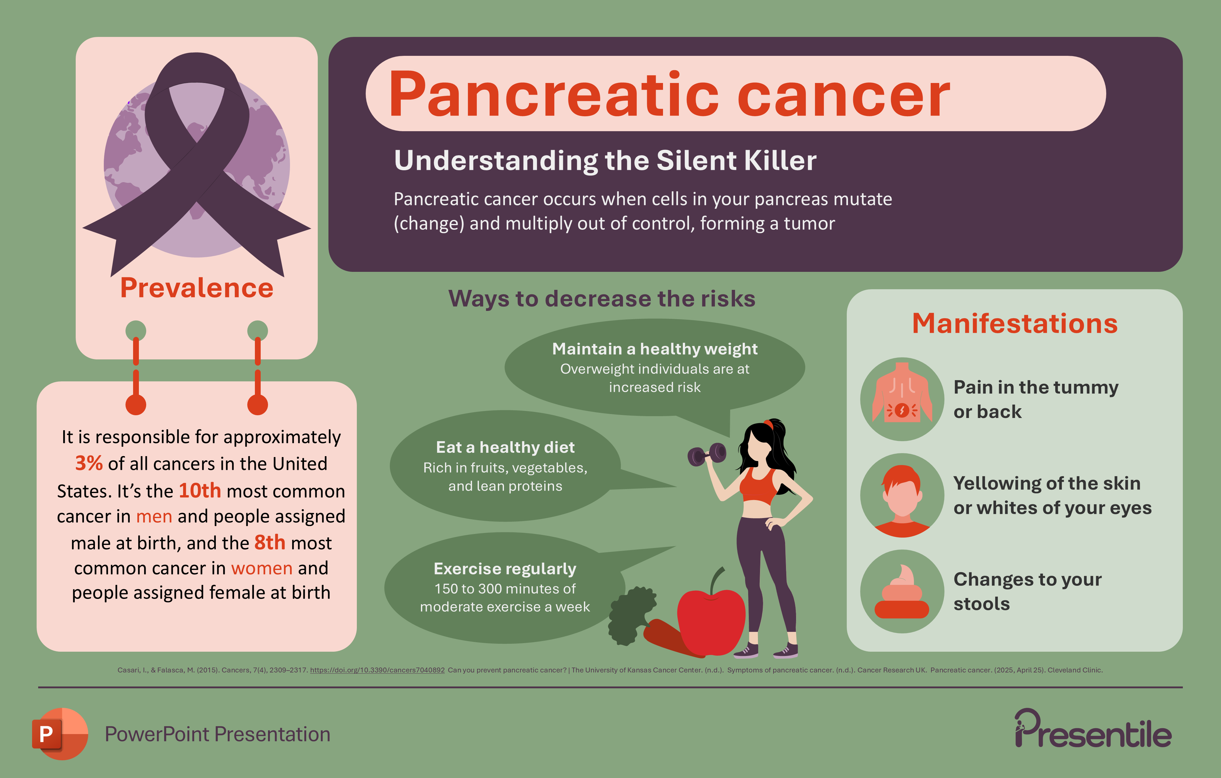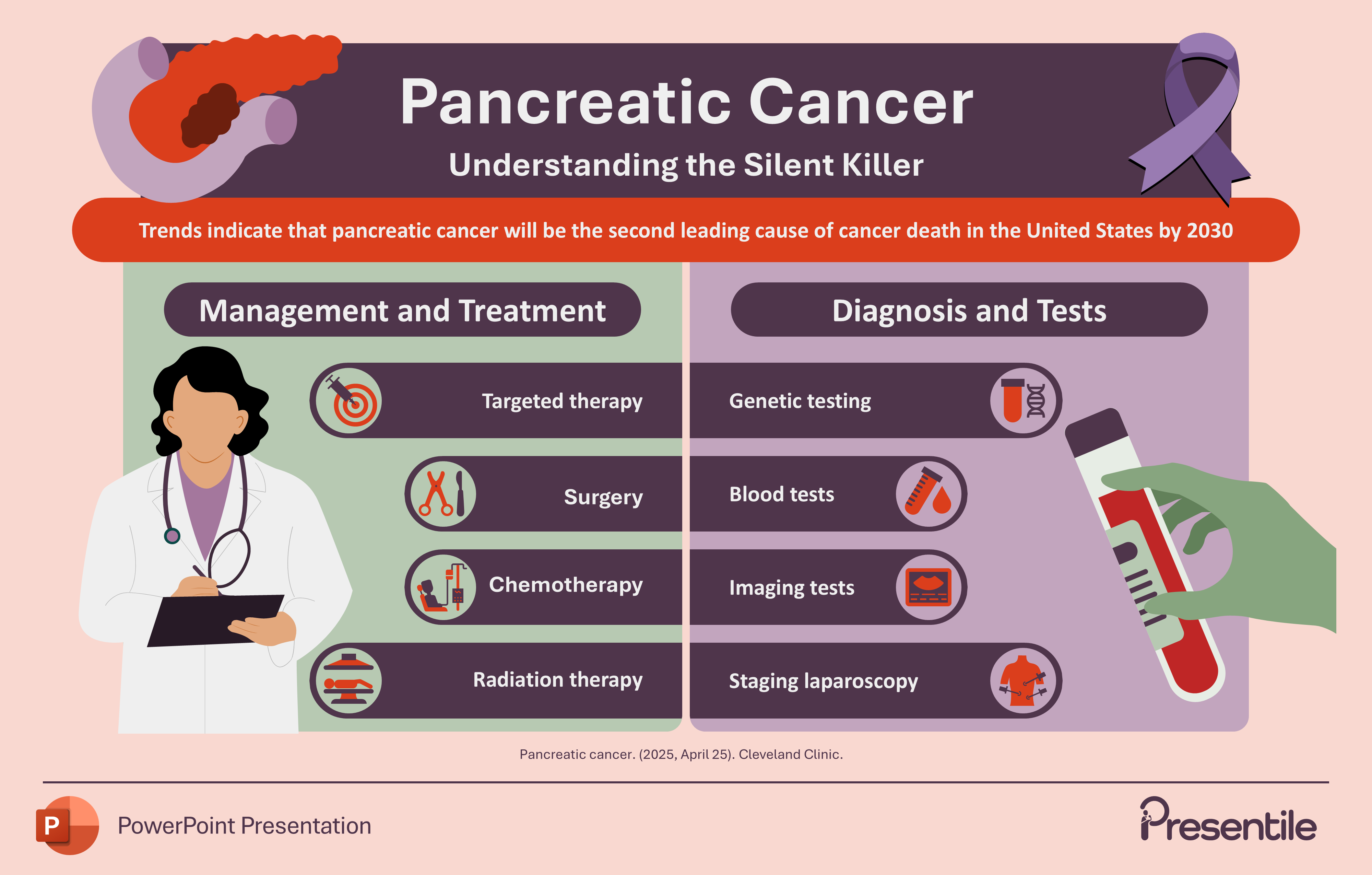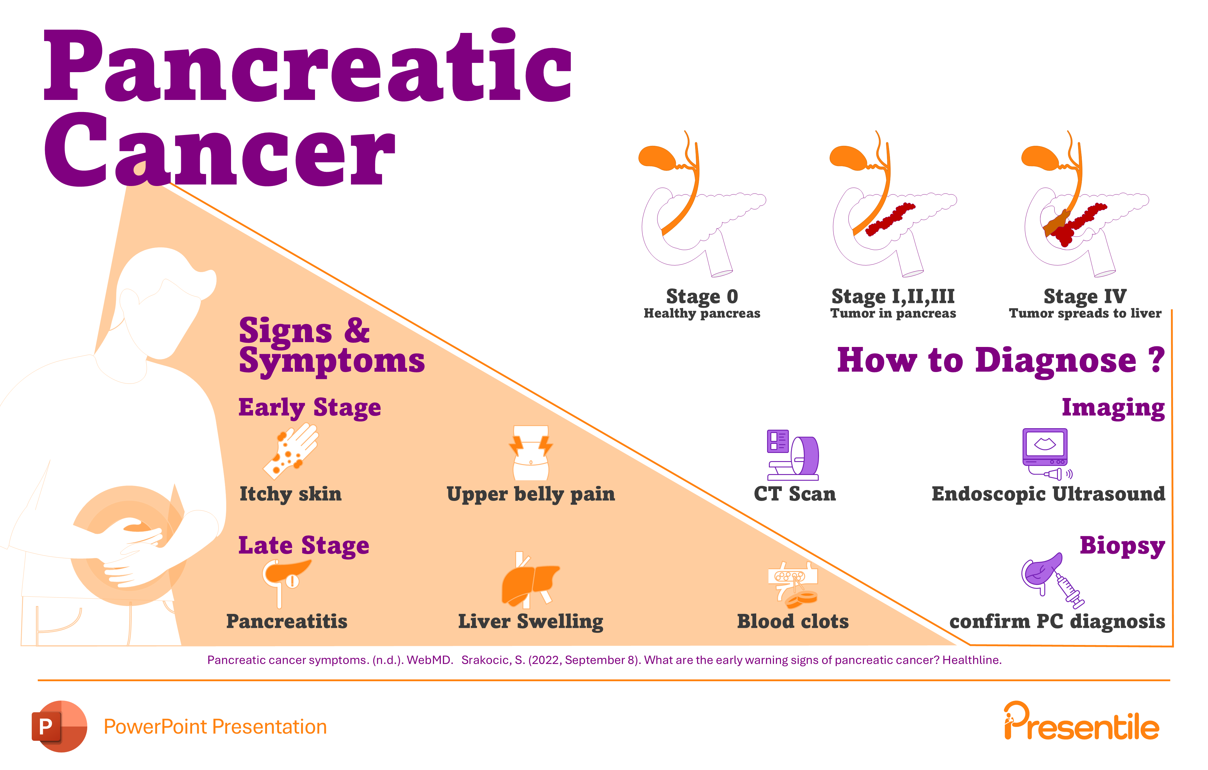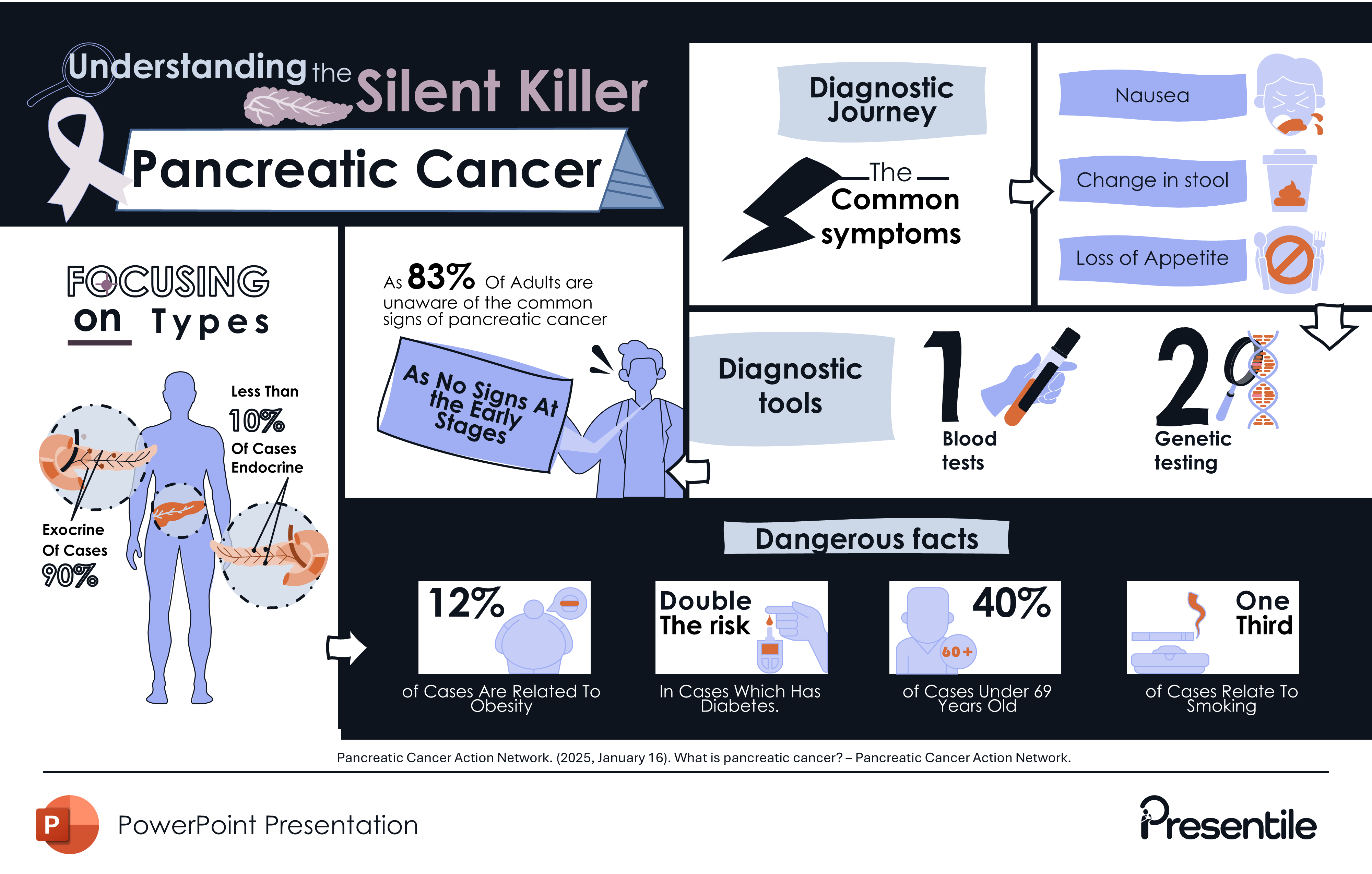 • Introduce the Context: You can use the striking title and ribbon graphic to highlight pancreatic cancer as the "Silent Killer" and categorize the listed symptoms as typical of the late stage of the disease.