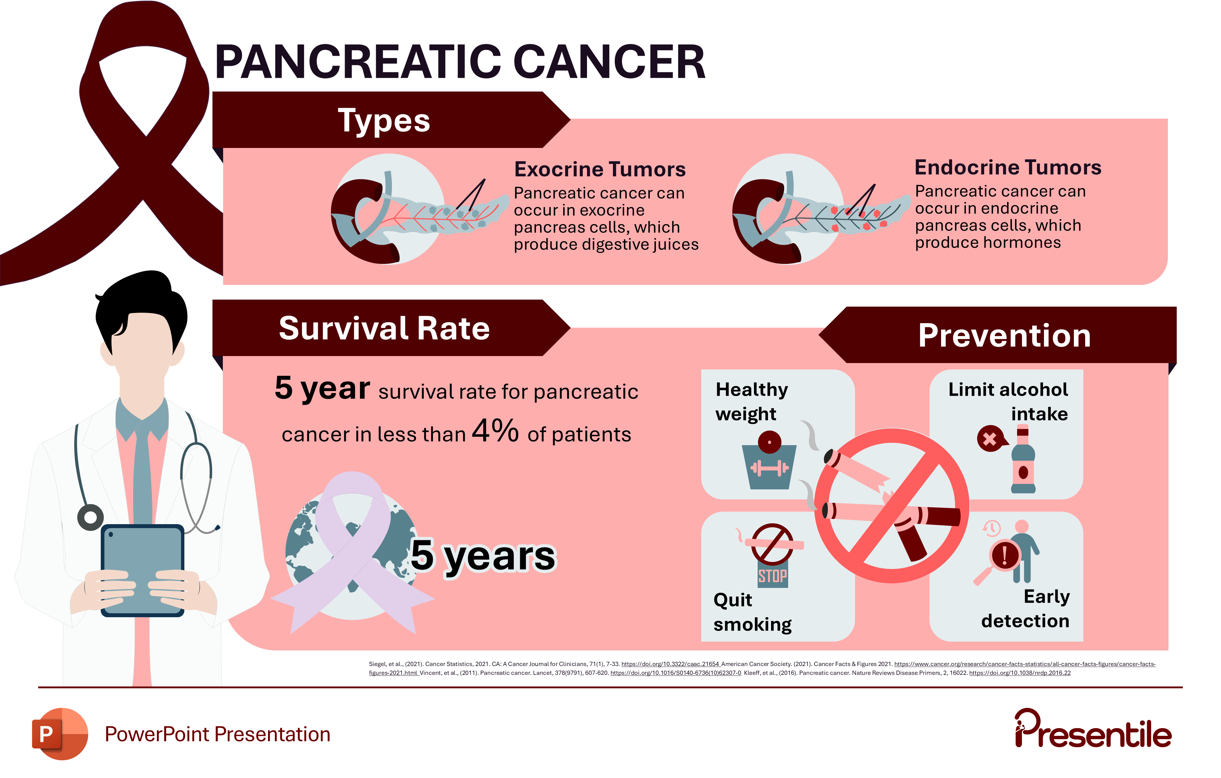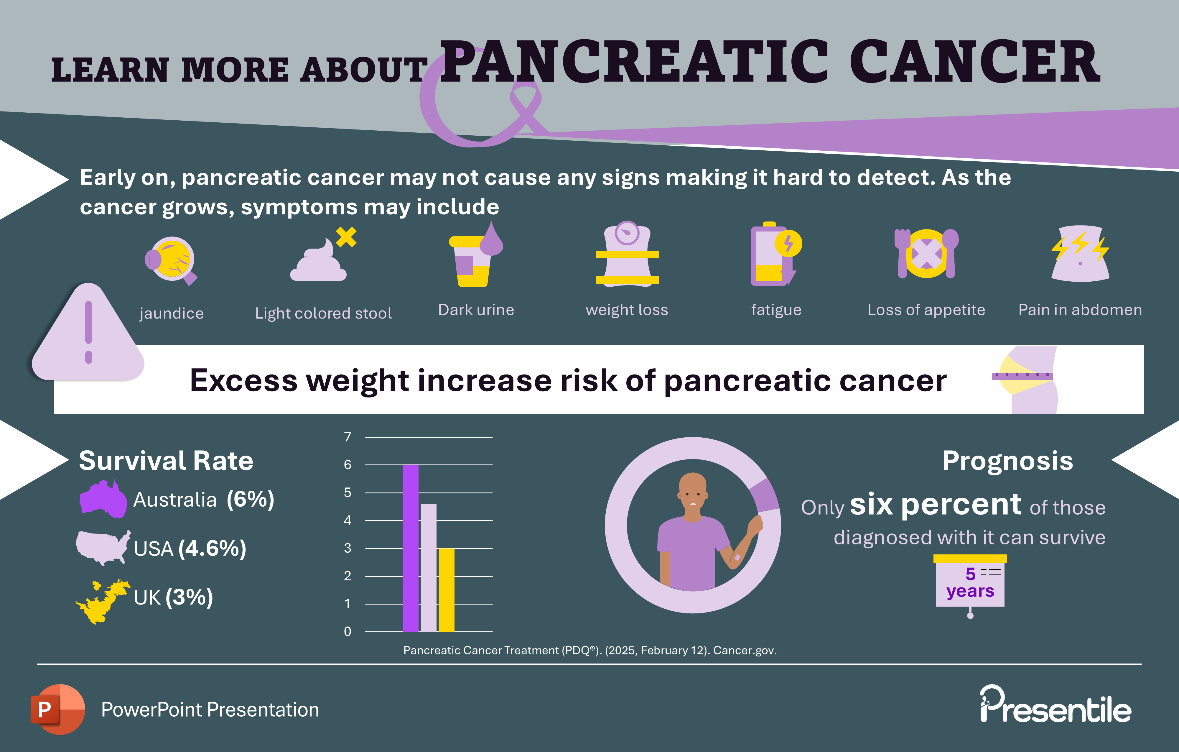 • It highlights the grim prognosis by stating the 5-year survival rate for pancreatic cancer is less than 4% of patients, emphasizing the need for proactive health measures.