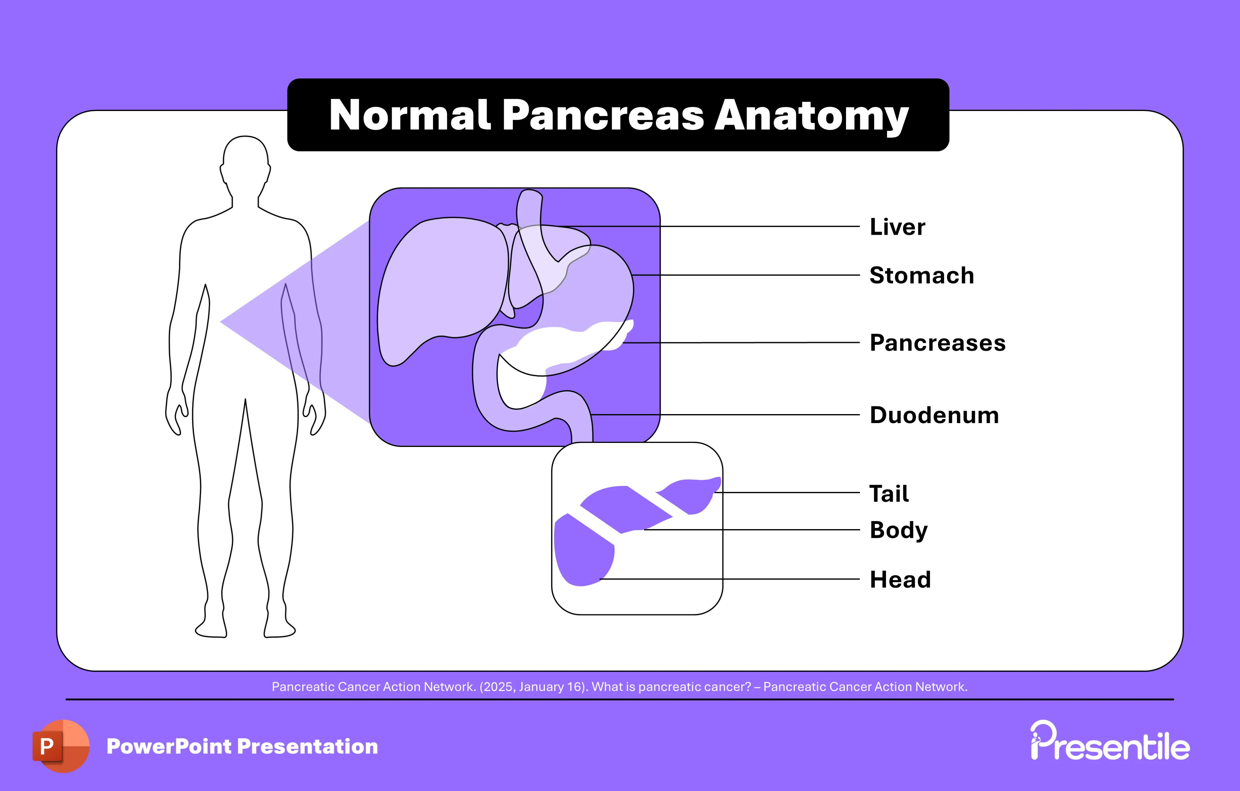 • This professionally designed PowerPoint slide provides a clear visual introduction to pancreatic cancer presentations by illustrating the normal anatomy of the pancreas.