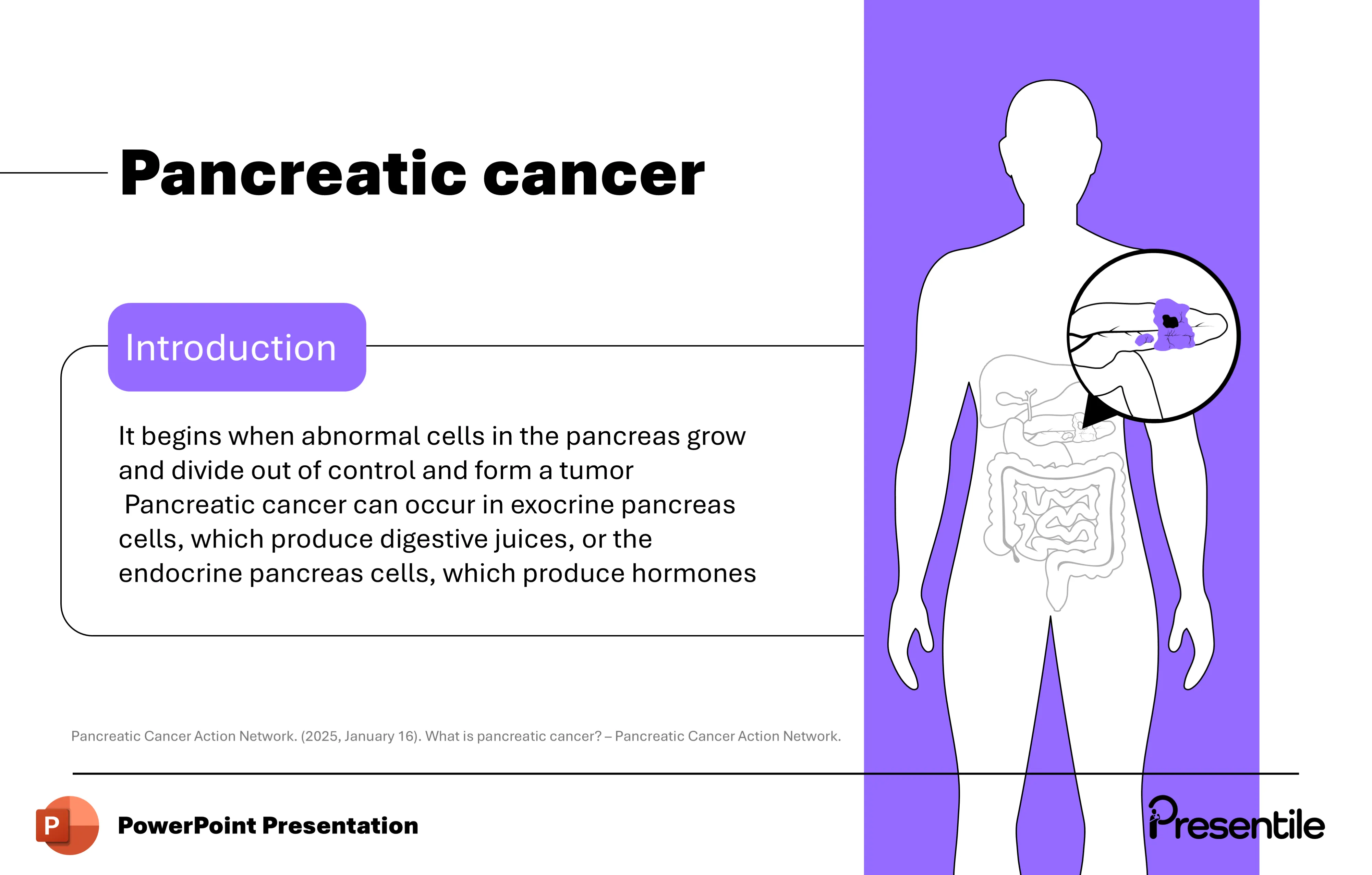 • This professionally designed PowerPoint slide provides a clear introduction to pancreatic cancer by defining the disease and illustrating its origin.
