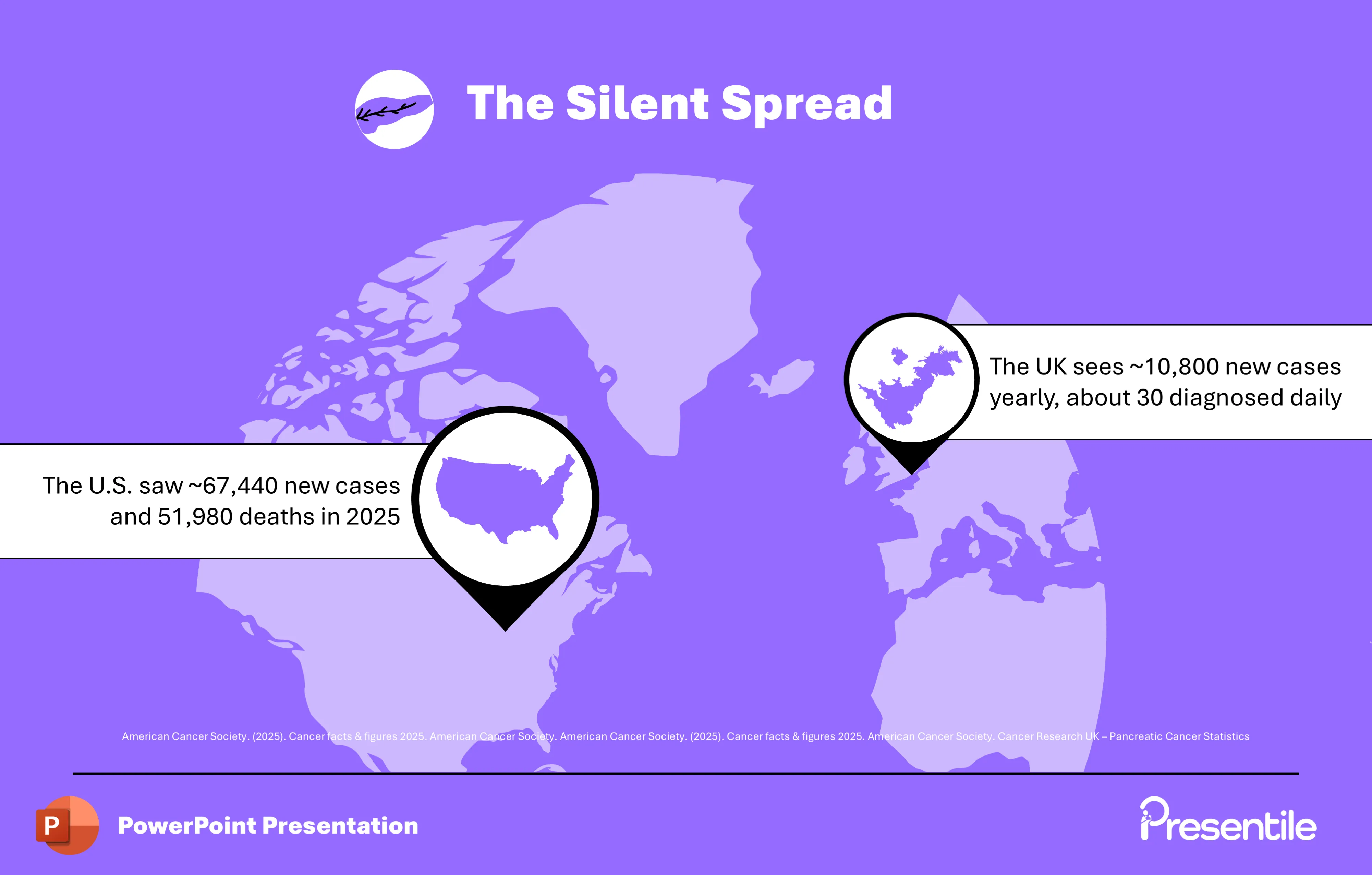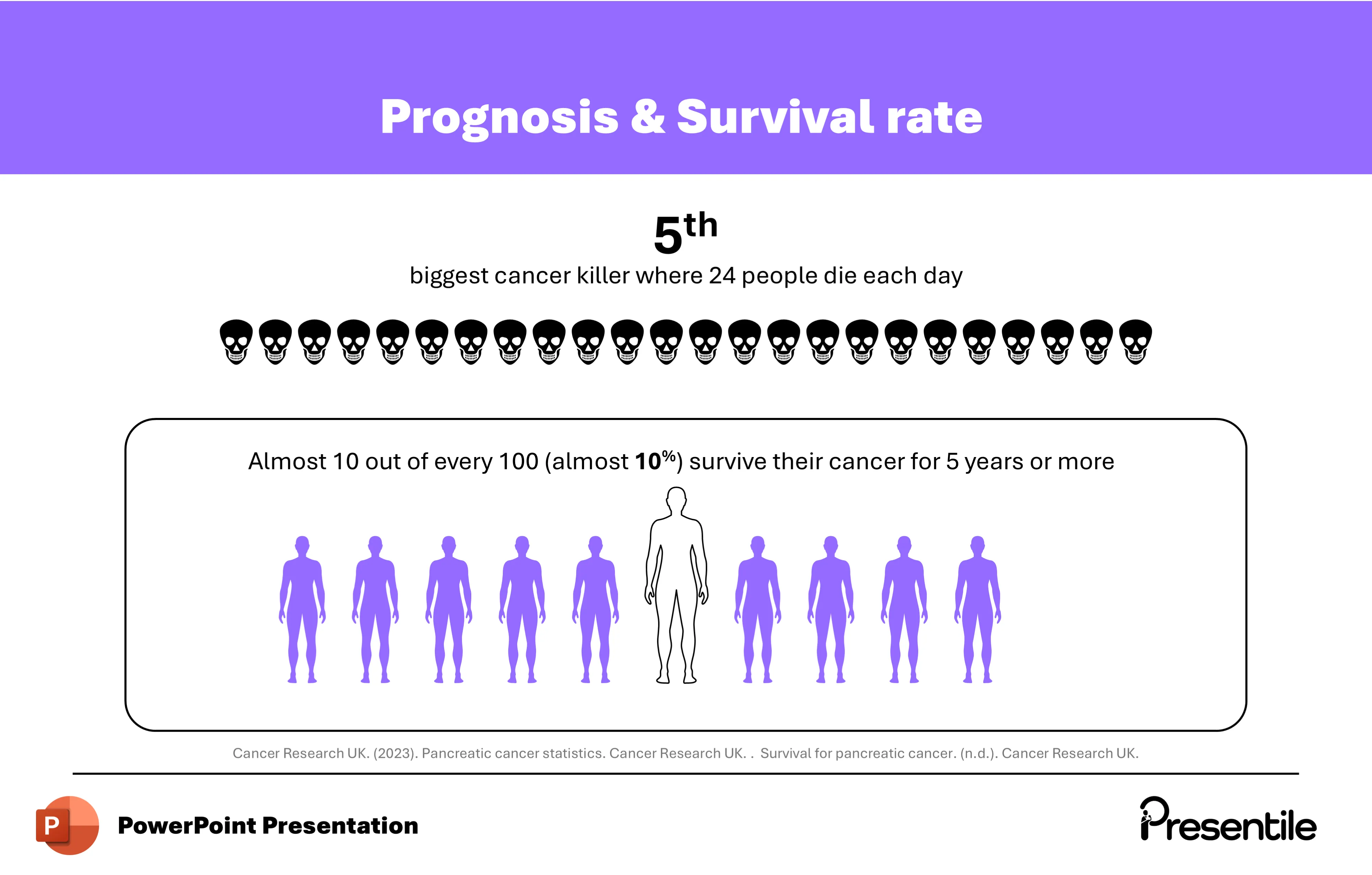 • It highlights that pancreatic cancer is the fifth-leading cancer killer, with approximately 24 deaths each day, while the five-year survival rate remains low at around 10%. Using clear, impactful visuals,