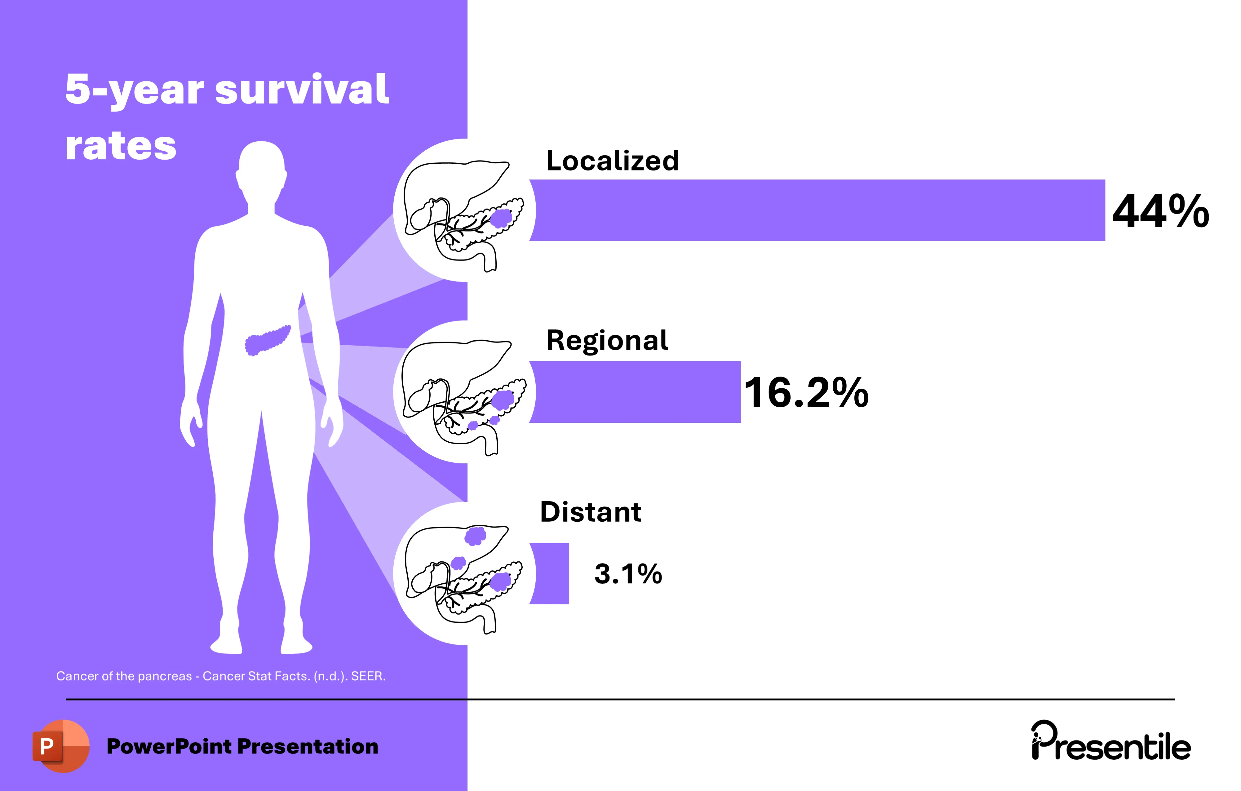 • It visually highlights that patients with localized tumors confined to the pancreas have a 44% survival rate, those with regional lymph node involvement drop to 16.2%, and distant metastatic cases have only a 3.1% five-year survival rate.