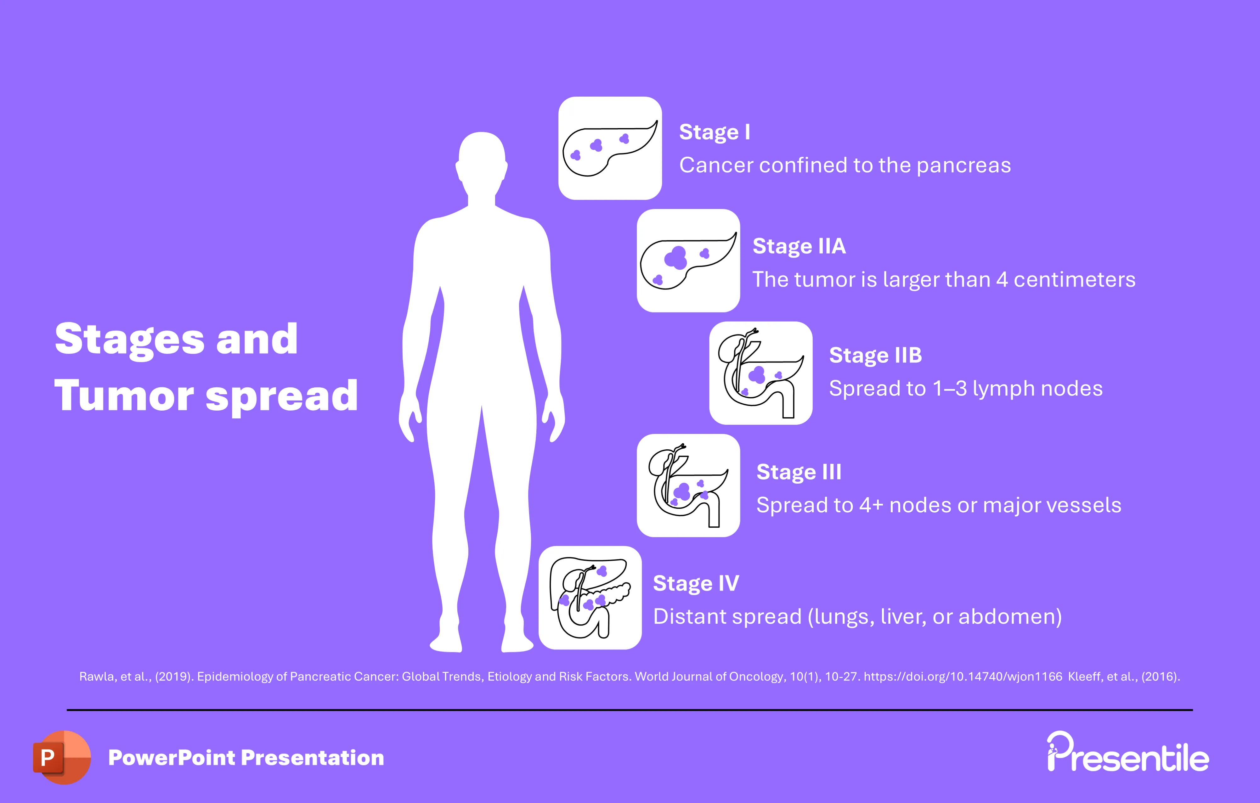 • This professionally designed PowerPoint slide provides a clear visual guide to the stages and spread of pancreatic cancer, simplifying a complex clinical concept for your audience.