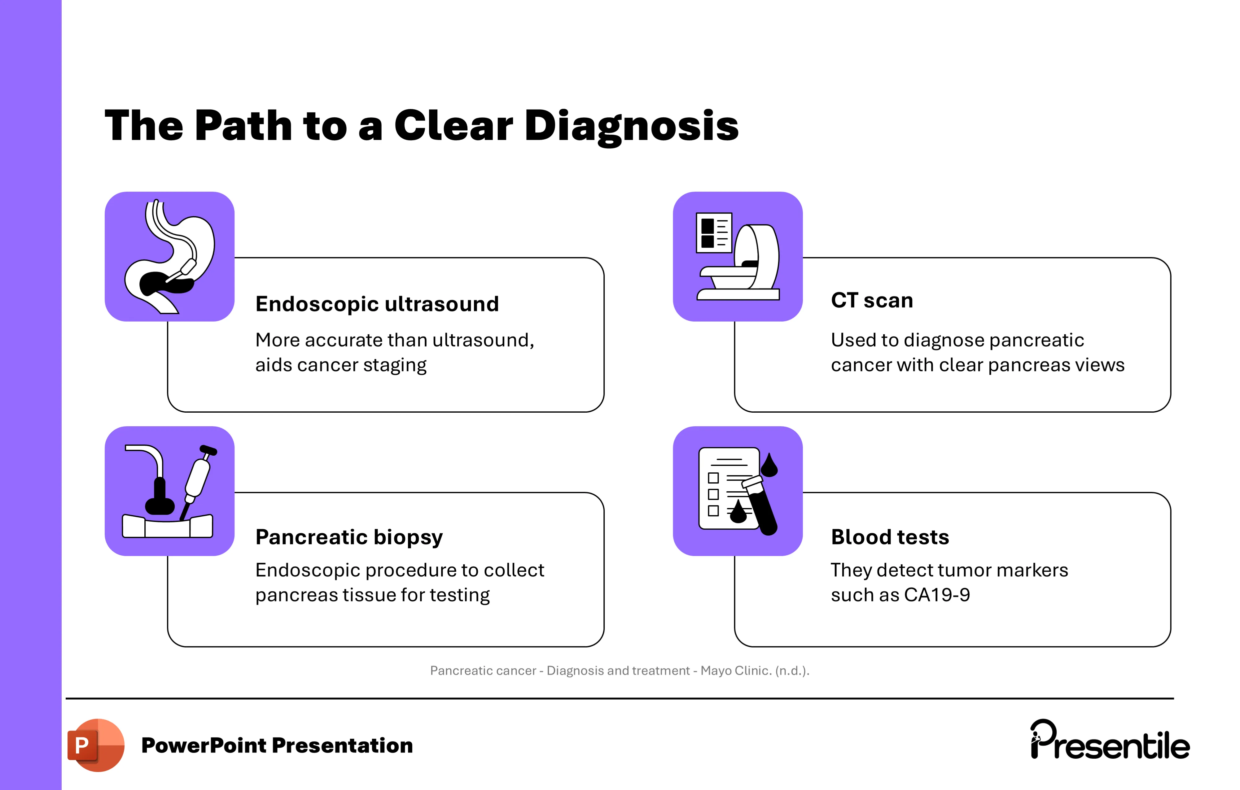 • This professionally designed PowerPoint slide provides a clear overview of the key diagnostic procedures used to identify pancreatic cancer, presented in an easy-to-understand, icon-based format.
