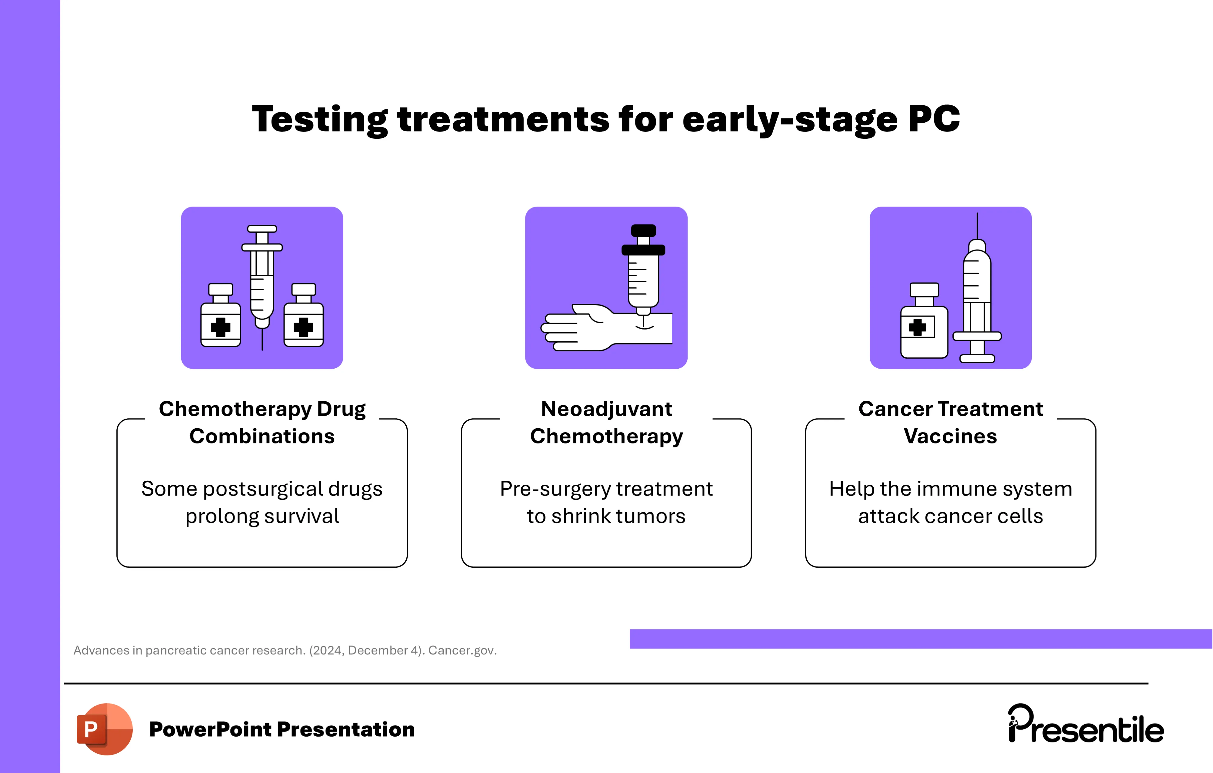 • This professionally designed PowerPoint slide provides a clear overview of early-stage pancreatic cancer treatments using a clean, icon-based layout.