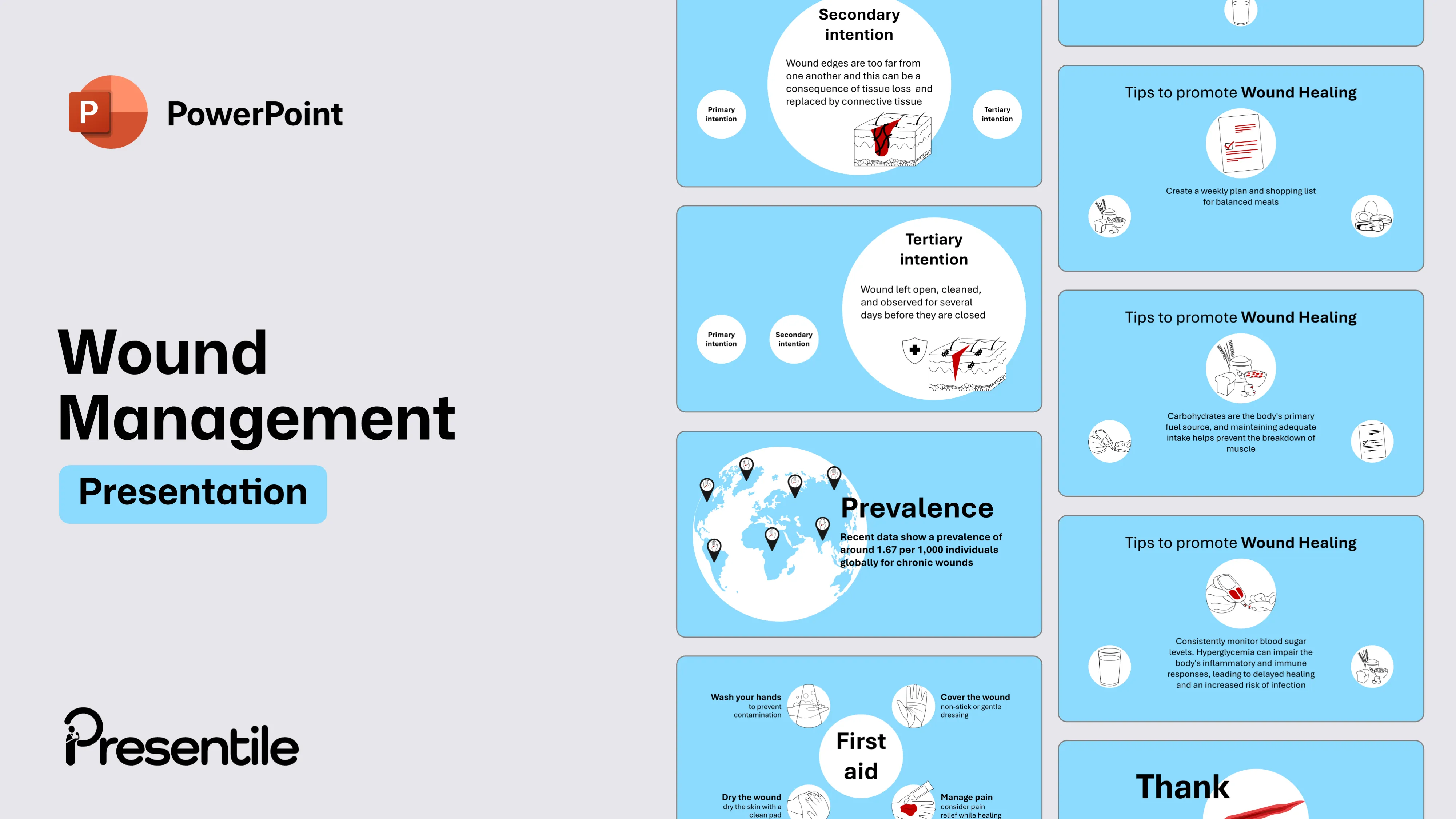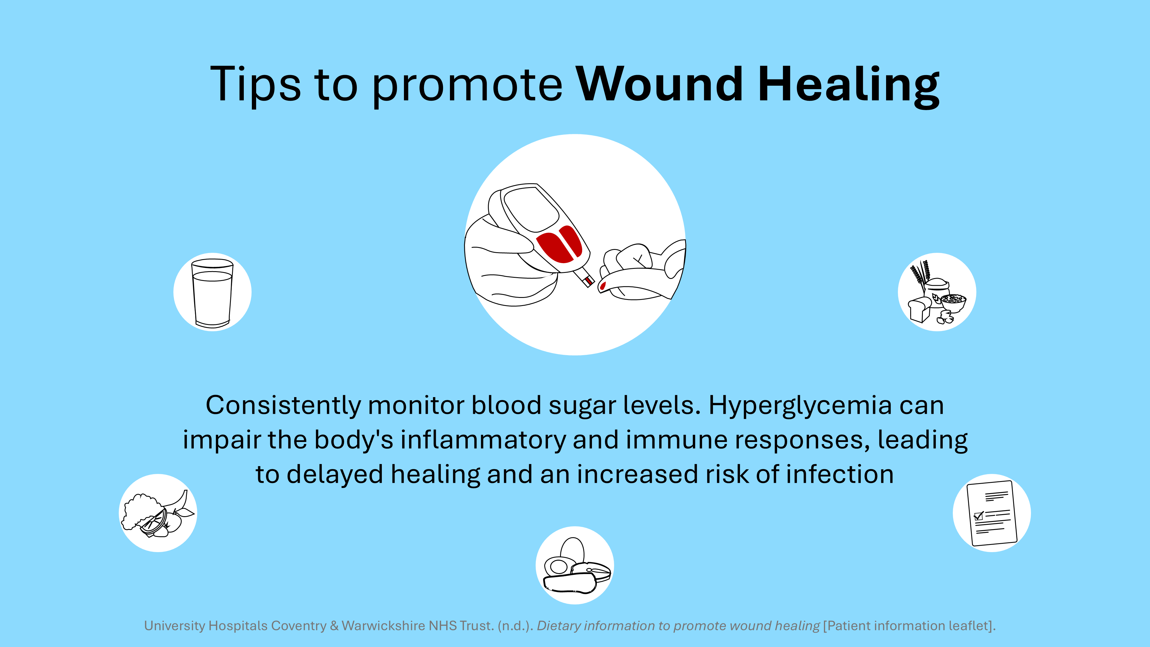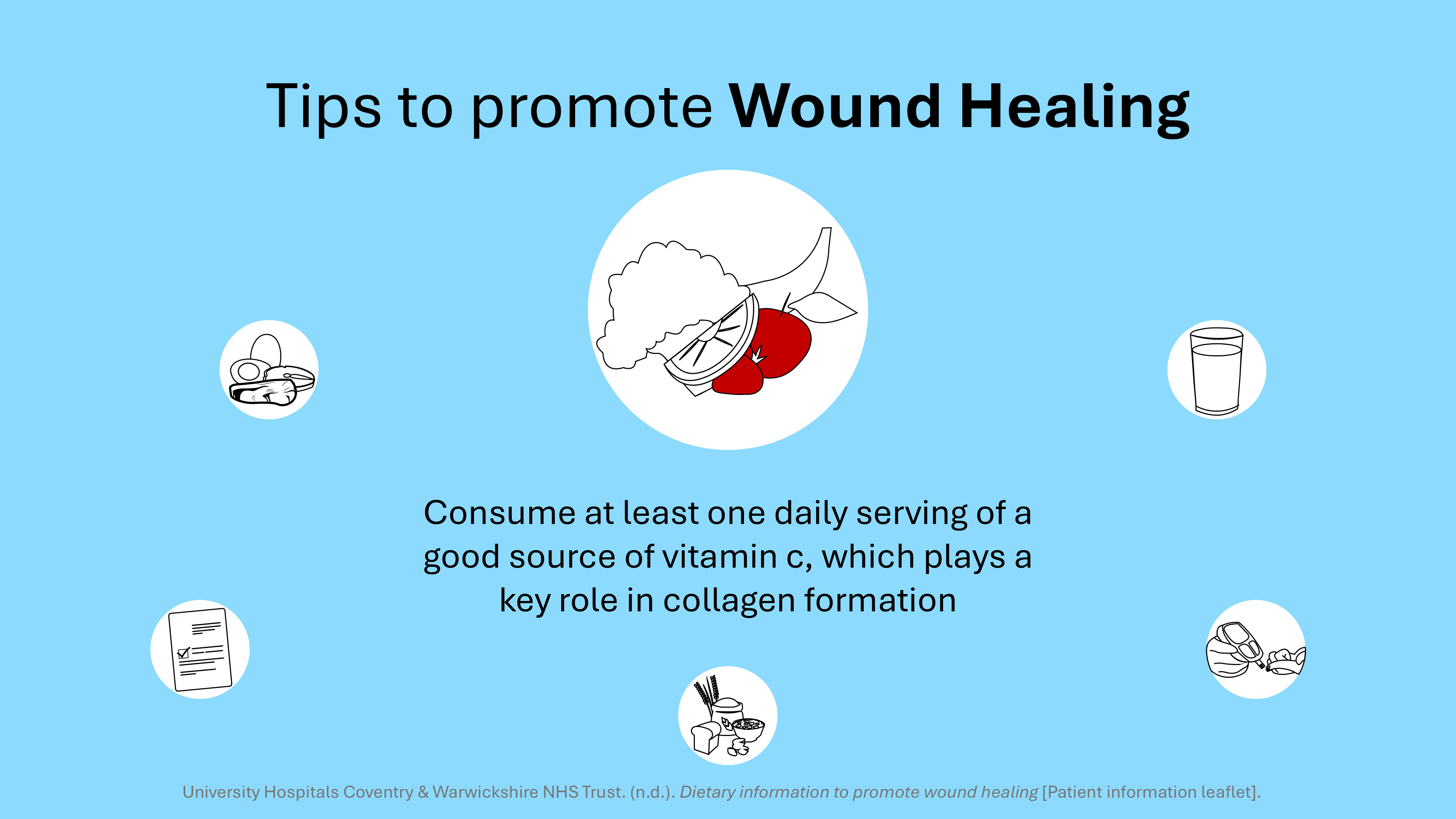 • From nutritional advice (protein and vitamins) to hydration and following medical instructions, the slide visually reinforces the holistic approach to effective wound management.