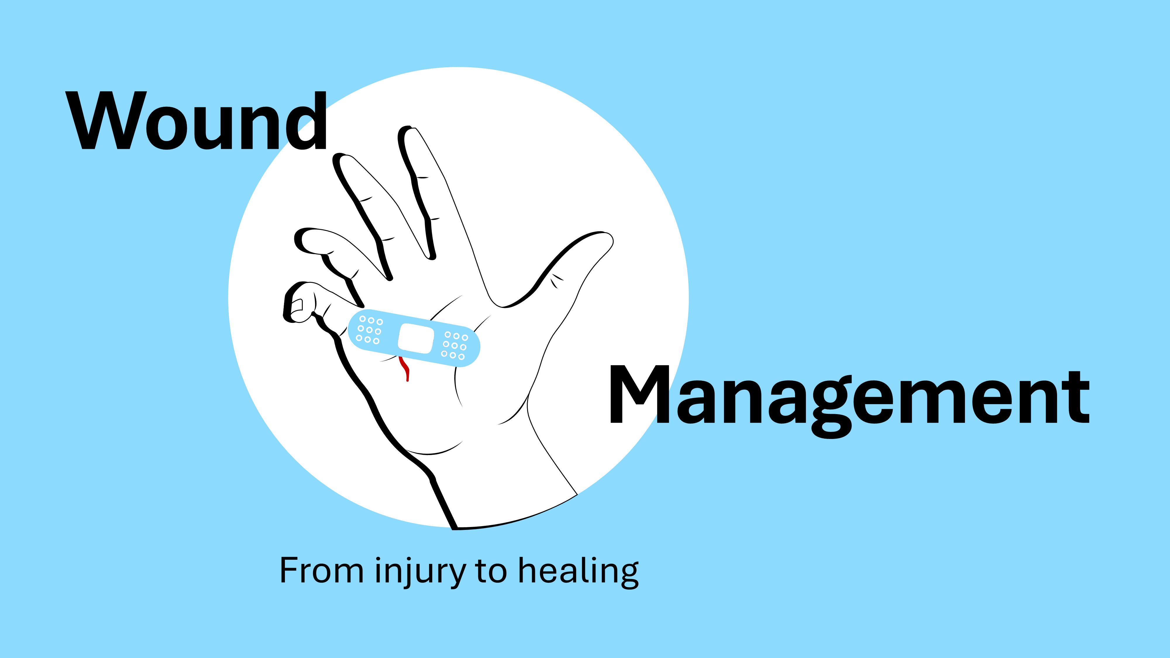 • This title slide instantly grabs attention with its clear, minimalist design. A simple, compelling visual—a hand with a small, bandaged wound—is centered to introduce the topic of Wound Management.