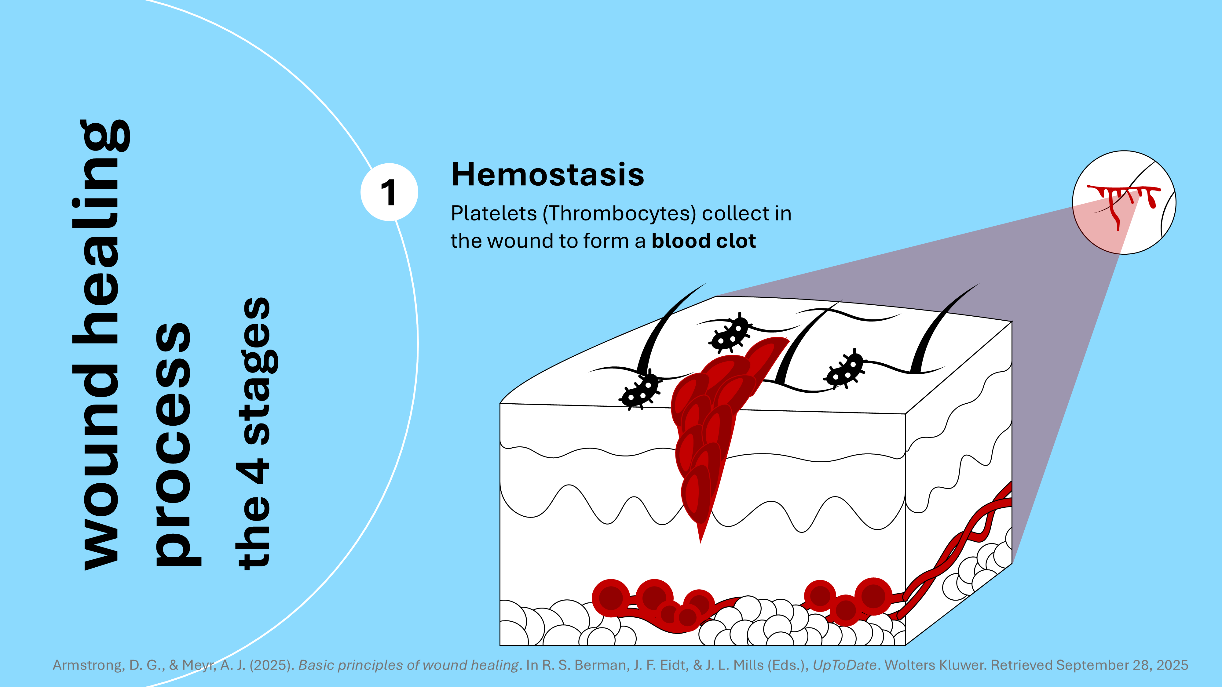 • This slide focuses on the first critical stage of wound healing: Hemostasis.