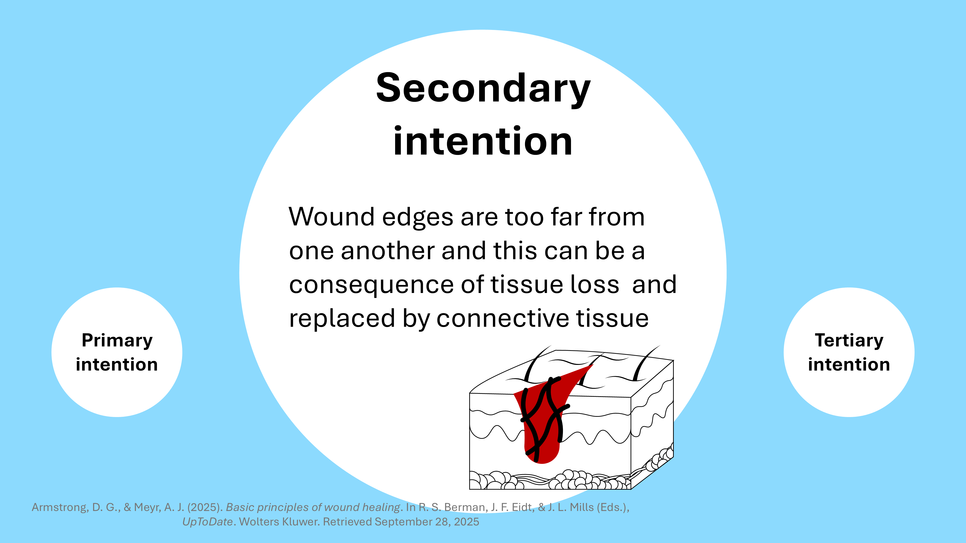 • This slide explains Secondary Intention healing, which occurs when a wound’s edges are too far apart to be brought together.
