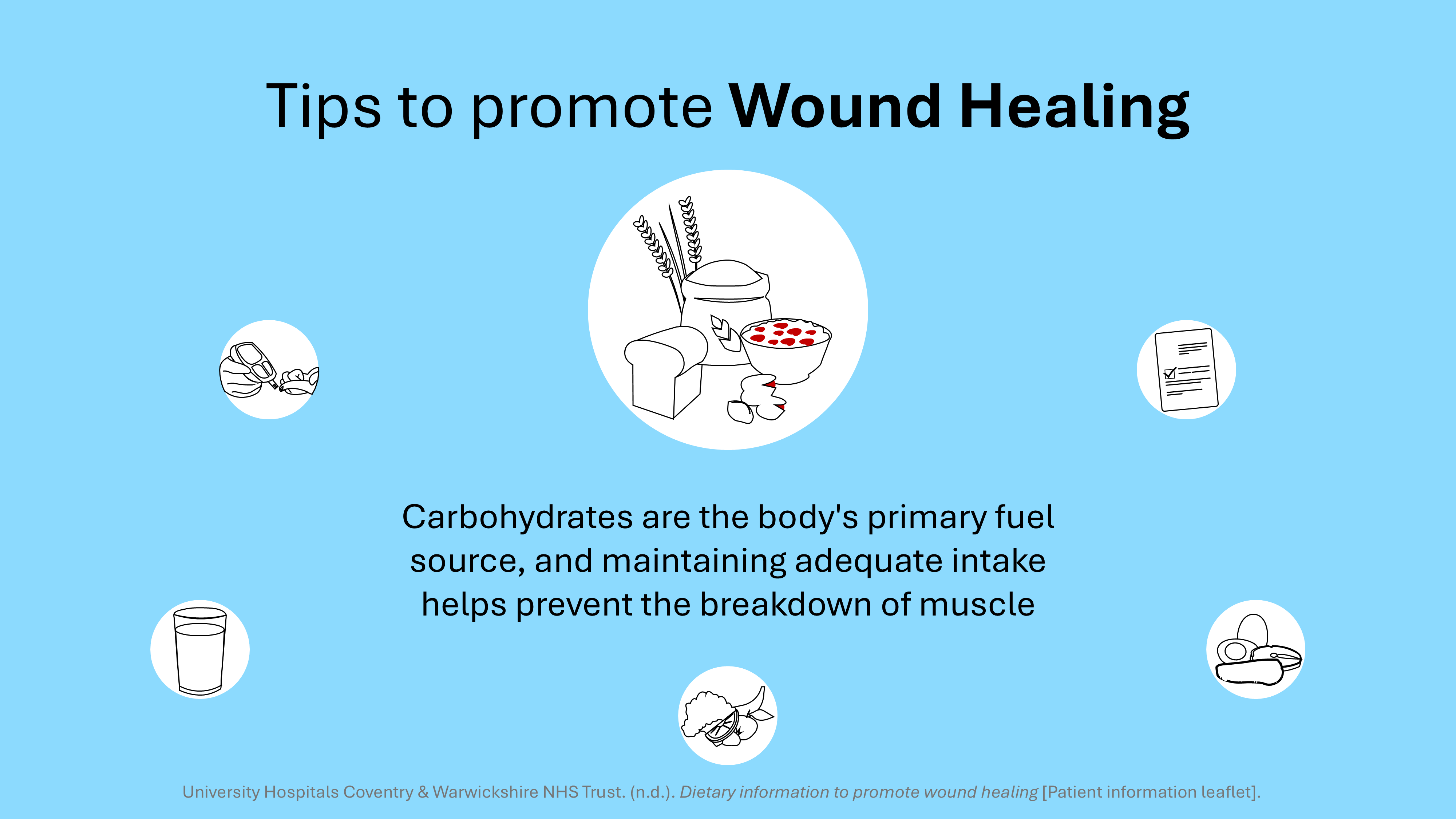 • This slide emphasizes the importance of carbohydrates in the healing process.