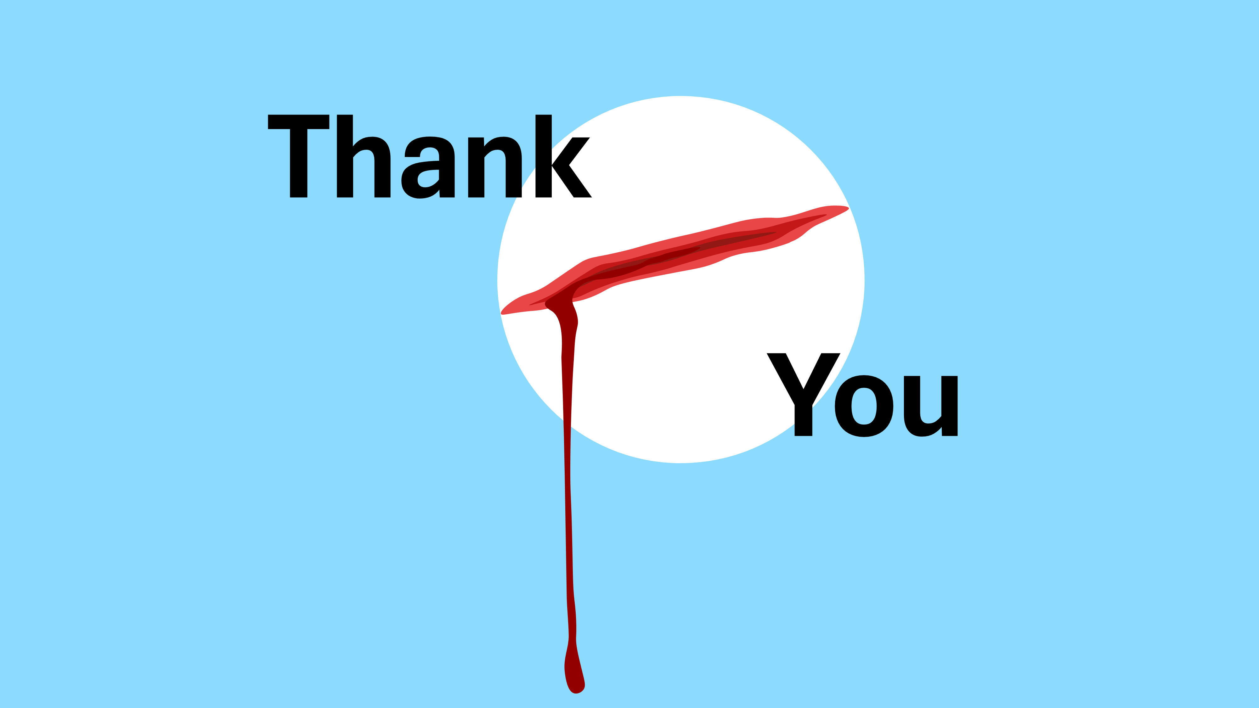 • This final slide is a powerful and memorable conclusion to the presentation. The words “Thank You” are split on either side of a simple, stylized image of a wound bleeding.